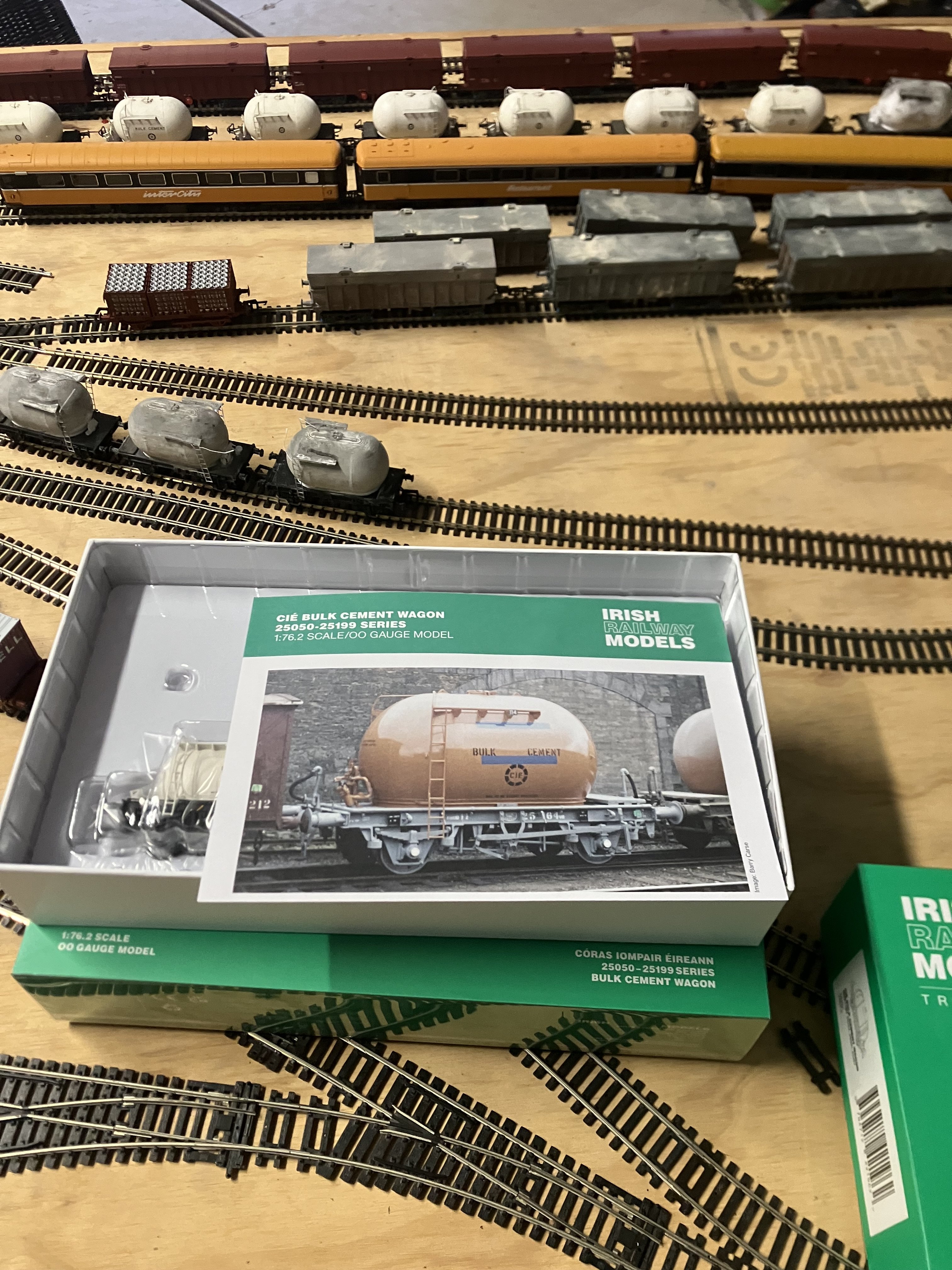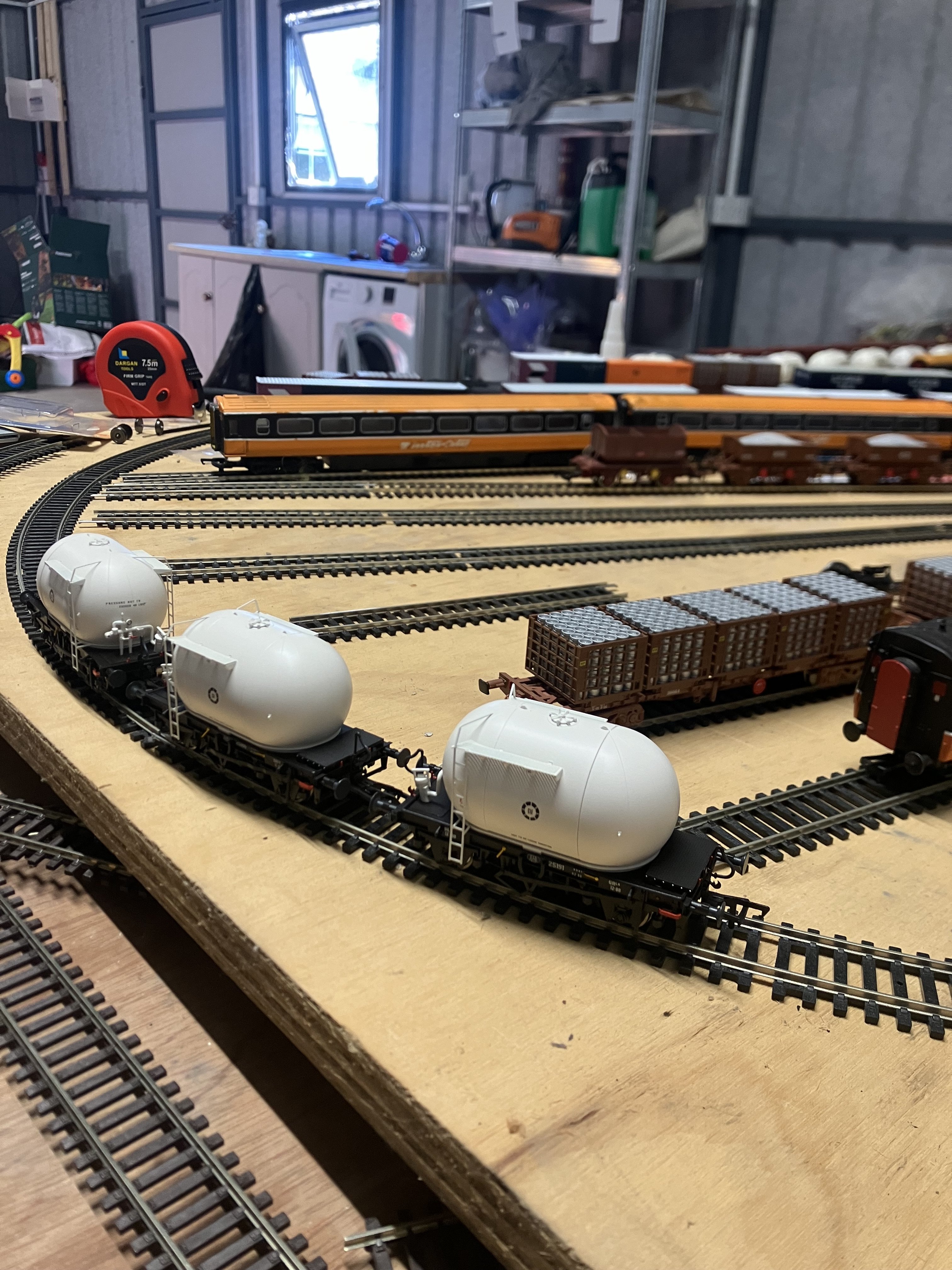 Pre existing layout: The start of the Journey Finally got around to taking pictures of my current makeshift layout before I started planning this project and writing this forum: a couple of things to note space for future layout: fortunately im quite lucky to have a large garage 6m x 9m shed to set up shop for my layout.( see pictures below) this gives me a great foundation to start and to give ample space to plan and built the future baseboard for this layout. I plan on having two baseboards joining together( I’ve marked baseboards on my original drawing of the layout in picture 3 below) the main baseboard which will have the majority of the layout -Drogheda Macbride station and Buckys siding (red baseboard on layout plan in picture 3) the additional baseboard will go off the main baseboard at an angle which will include the navan branch line from the station all the way out to Platin and the Platin sidings.( green base board in picture 3). This then gives plenty of space between two to walk around and access to track, or as the the scholar @dereks coined it “reachability” The current baseboard: in the picture below is the left over baseboards from my childhood layout that my dad built for me many moons ago. This is currently just thrown together to allow me to run the trains for fun and to enjoy as I built my collection why is the layout on the ground you may asked ? Well the layout sat on four trestles but unfortunately are missing in action since I returned home from Uni Future baseboards : Thankfully with the garage there is a lot of space to spare, this will allow me to construct an even bigger baseboard and allow me to be smarter with the shape of it. Currently pondering about buying a baseboard from Modelrailsbaseboards,especially as you can take them apart quite easily. This will decision will be made after I fix a number of track plan issues that I currently am experiencing current track plan and parts of the layout. Below I’ve attached photos of the current layout and protypical photos of what McBride was like in the 90s. The track I have available is what I had to make do with from my childhood collection Above the 3 roads of drogheda station including the famous middle row,filled with 201 and bubbles,cravens in the middle row and some IE mark 2s. Below is some image of the 3 roads from the southbound section of the platform ** issue- I feel like on the layout these three roads should be closer to together access to the Yard: which is a curved point off the inside main line vs what it looked like in real life below issue- as you can see in this pic where my Bachman 2700 is parked, the sharpness of the the running line radius restricts the length of the yard,in future I may have to invest in flexitreck to made the the running line where the mark 2s are parked to be longer and less sharp to give more inside room for the yard ** Currently struggling with connecting the middle row to the outside bend, I think flexi track is going to be needed in order to connect the middle row and outside bend. The prototypical looks so easily connected Notice the points inline with the 1st mark3 carriage how it curves out of the outside bend as the platform starts The view from what will be buckys bridge… think I’m looking forward to modelling this part the most as it will be give me a chance to do a lot with the trees both sides of the track below are pictures of the navan branch and platin section of the current layout : The navan branch will need to be longer and required a less of a curve Platin: I’m currently quite happy with the track plan of platin bur will need to make the sidings longer,again will come in due time when a more permanent baseboard arrives enjoy the pictures,any tips or tricks would be greatly appreciated and I’ll accept with open arms Thanks Dave- 30 replies