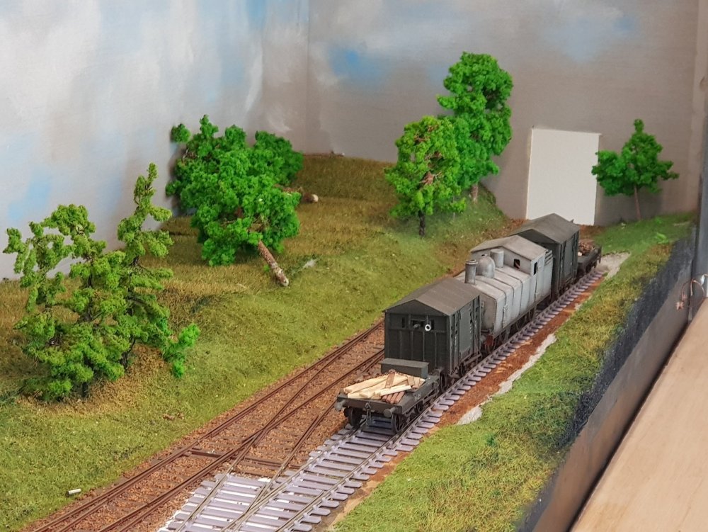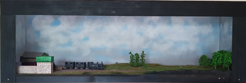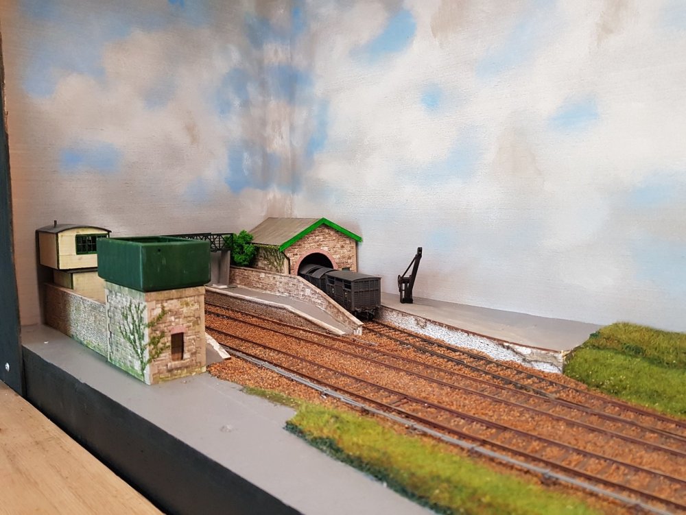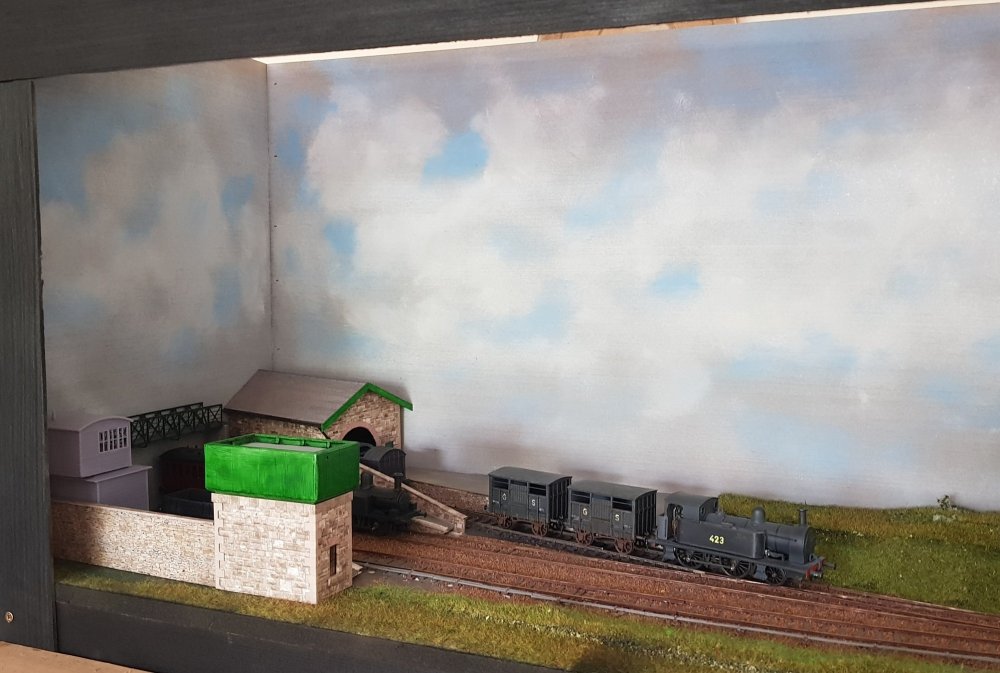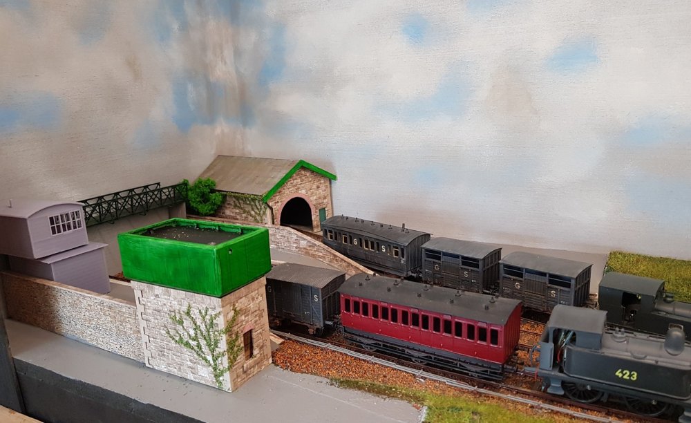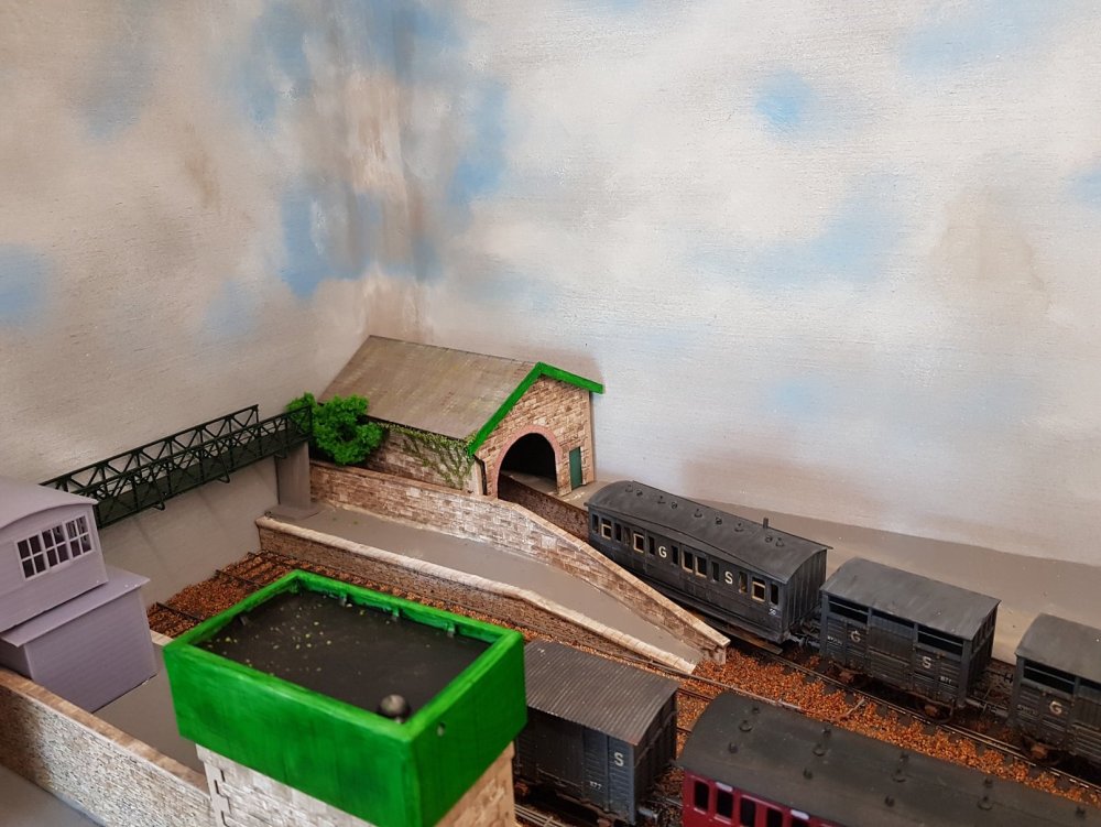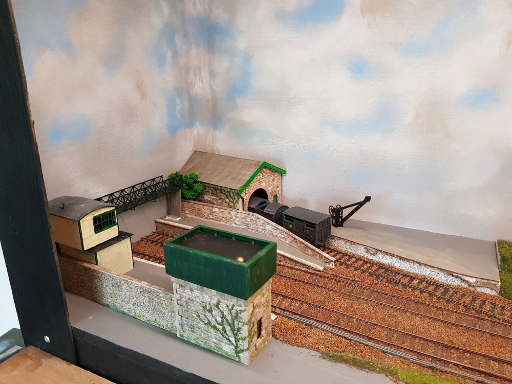Actually I couldn't - the sharp corner in the sky was just distracting, so a bit of filler & painting, those corners are softened which helps to focus the eye on the models themselves. So progress on the layout included track ballasting and some weathering on the goods shed & water tank. Points have have also been connected and are manually operated via wire in tube - so now the layout is operational & trains can trundle up and down! All for now!