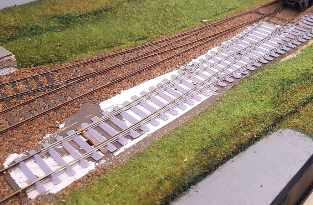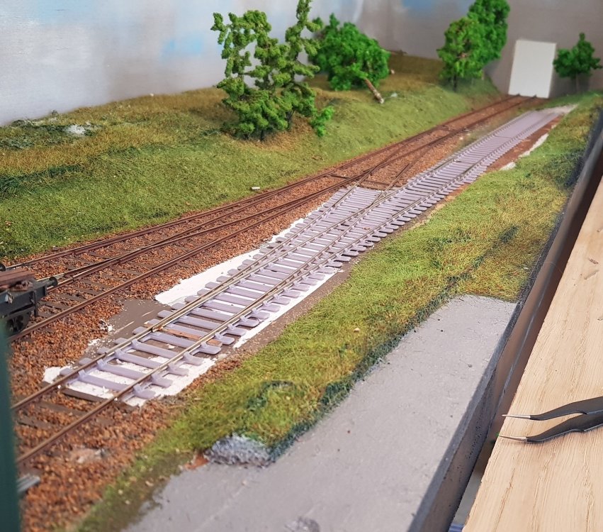The layout was out at the last Bray fair, however it proved somewhat limited in operation, so I decided to add a headshunt which will provide more operating possibilities, plus more space to show models. The existing points were A6, so an A6 point was printed off and made up with some straight lengths for the headshunt itself. Existing track was cut and new rails modified to match the divergent rails from the incoming point. Straight track added to provide space - scenic section needed to be cut back a little, which should provide a nice detail when dressed down to the track level. Nothing fixed down yet - just needed to check all is working and stock moves freely in all directions. What looks like a wobble in the straight track is a catch point, basically made up of the leading section of the point print. All working fine so I can get on with fixing down, painting and ballasting. But in the interim, a quick shot with the armoured train. All for now. Ken