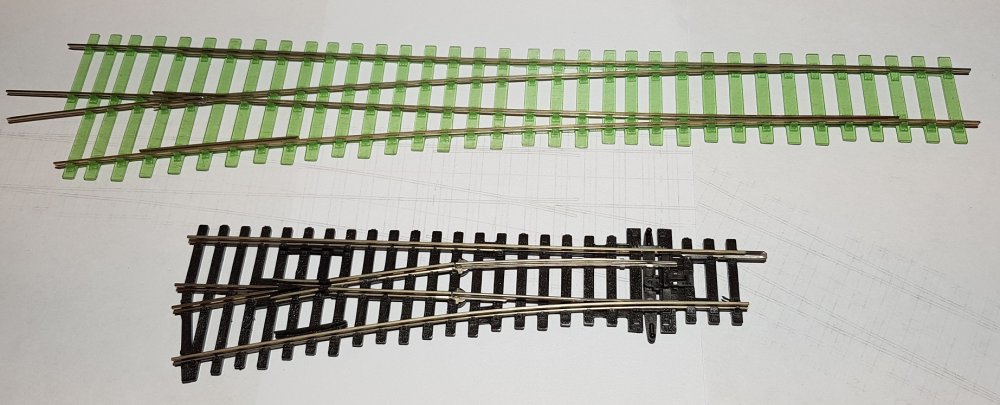 Thanks @Galteemore, I suppose given my journey so far, I can provide some insights..... MGWR110Bat, I model in 21mm and as it happens P4. I agree with Andy regarding P4 vs EM - you do not have to jump straight to P4. As noted P4 flanges and tolerances are much tighter which does take time to get right. As to your model, I would hazard that it is a TMD kit originally released in 1981 which was the building blocks for the Studio Scale Model (SSM) version. I built one of the TMD versions, but built it as 560 as used on the Tramore line - my area of interest is the DWWR / DSER / GSR. To provide some additional information on your questions: 1.) Where would be a good place to start sourcing some suitable axles for 21mm Stock? Either make your own as Andy suggested, or split the axle and sleeve with 2mm ID brass tube, or shop with Scalefour society shop (https://www.scalefour.org/stores/stores.html) 2.) Has anyone tried regauging 16.5mm stock to 21mm? What was required and how did you go about doing it? I generally build my own locomotives and stock so don't have much experience. I do know modifying steam locomotives is difficult as there is insufficient space in the splashers to allow the wheels move out. 3.) Any recommendations for sourcing further M&GWR and GNR(I) locos and rolling stock from the latter part of the 19th Century through to the 1920s? There is not much out there for MGWR - @Mayner does some models kits in brass, and @leslie10646 does quite a few kits for GNR. My stock https://irishrailwaymodeller.com/forum/65-kmce-models/ is mainly DSER for now. 4.) Unrelated to the M&GWR, but anyone tried converting a Hornby 4P tank into a UTA 'Jeep' in 21mm or is that a stretch too far? The Hornby 4P can be converted to a lookalike and others have done it. As mentioned by others Worsly Works do some etches for the Jeep, but they are really scratch aids and need a lot of work to develop to a running model. I am building one (now and again) and it has proved to be quite a task. With regard to building track and points in 21mm, the traditional route was ply and rivet with the necessary gauges, again all available from Scalefour shop, however with improving technology, 3D printing is getting closer to being mainstream. Straight track in any methodology is quite simple and straightforward, points take a little more effort. I have been dabbling with the 3D printing route, but started with the ply and rivet method - 3D printed version is so much quicker! This is a mix of ply and rivet and 3D printed - older finished track is ply & rivet, and obviously new point and headshunt is 3D printed. One thing to bear in mind is that 21mm track needs quite a bit more space- points are longer than mass manufactured versions. Top point is 21mm B6 point, while bottom is Peco short point for reference. Hope this is of some assistance. Overall 21mm is a challenge, but well worth the effort. Good luck with your venture either way. Ken