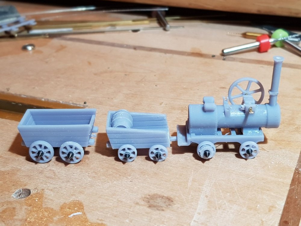 Eoin, Many thanks for that - I had neglected to look to Shepherd & Beesley and was using an article published by the Mineral heritage Trust of Ireland (https://mhti.org/uploads/2/3/6/6/23664026/the_avoca_mineral_tramway_a_further_look_into_an_early_co._wicklow_mineral_tramway._waldron_a_et_al__2004_.pdf ) which also noted that the section between Ballygahan and Arklow was 3'6". The run of the mineral railway to Avoca was sold to DWWR who used the trackbed for their own line with a new mineral line was installed away from the river. A transfer siding was provided in Avoca, to which the tunnel above connected, the tramline being elevated above the rail line to allow easier transfer. What has raised this query is a photo I discovered on the NLI which shows the ore wagons on track to the South of the station and bridge (https://catalogue.nli.ie/Record/vtls000338942 ). Any photo I have seen shows a twin 5' 3" line under this bridge, so I am a little unsure of how these ore wagons get to the South side of the bridge if they are 3'6" gauge, hence the query on the tramway gauge. What is also interesting in the NLI photo is engine shed and turntable - the turntable looks more like a glorified wagon turntable & it is noted that DWWR had responsibility for maintaining and housing the locomotives, so perhaps this is the tram loco shed? Sadly the OSI historical maps do not show any tramlines . I am in the process of building a model of the tram loco and wagons based on the 3'6" gauge, and from dimensions the wagons could have carried 2 tons of ore as noted by Shepherd & Beesley so these elements tally. Assembled temporarily with pinpoint axles - these will need to be trimmed before fixing. These are really small, the ore wagon being 22mm long - for context that drill in the background with the red collar has a 3mm shank. The intent here is to develop a model of Avoca station with the tramline in the background with the tipping wagons on the transfer siding in the background. I'll post more in the Layout section once I get an opportunity to make some progress. Ken