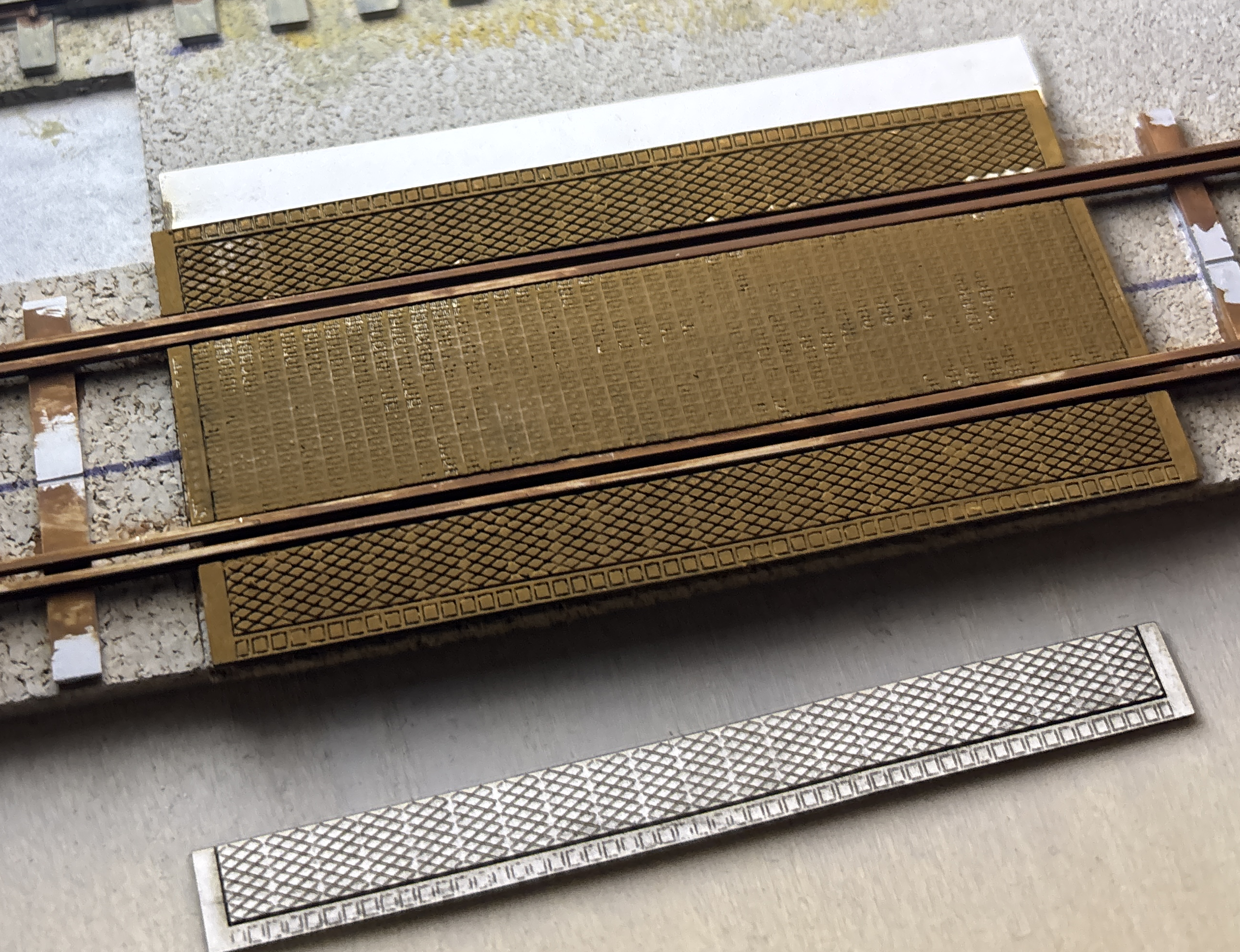 Weighbridge: I drew this up during the first half of this evening's IRRS talk, then laser-cut it and slapped some paint on. I'll probably fine-tune some of the engrave depths and do a final version for installation. I'll also need to put some slots in the rail heads to match the ends of the weighbridge. -
