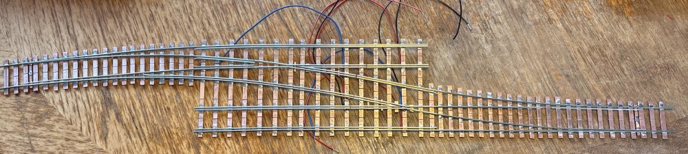 Switch blades now made and fitted, and some wires for power supply added too: I've tried a couple of wagons and they seem to run smoothly through it. The next job is a good clean up, and then I need to try and fill the insulation gaps in the 'timbers' so they're not so obvious. At the weekend I might put the baseboard together. -