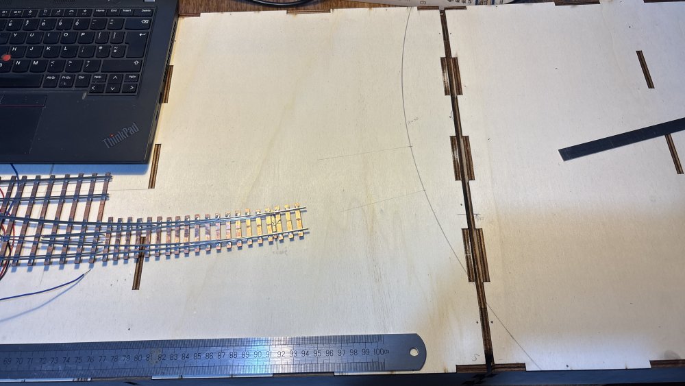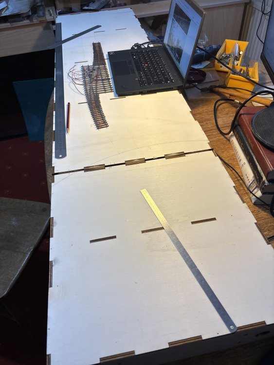 Today I have assembled the baseboards. I have also made a start transferring the trackplan from the computer to the board. This is a kind of 'human in the loop' plotting exercise... -