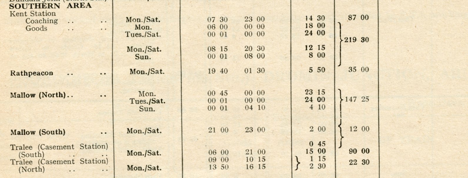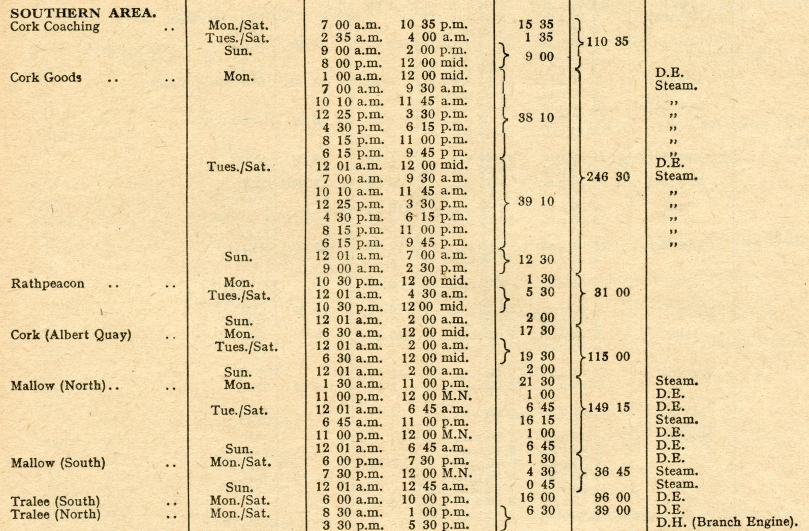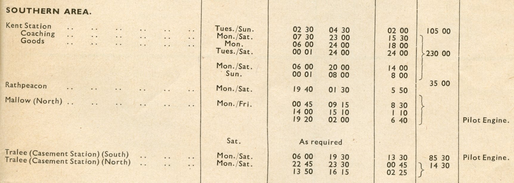 I'm making progress with my first 21mm gauge layout, a shunting plank based on Quartertown Mill near Mallow. I haven't found a great deal of information on how this was operated, but these notes from the 1966 IRRS Munster Area railtour (thanks to WestCorkRailway) give us a couple of useful snippets: 1. The line was in almost daily use, and was worked by the Mallow pilot engine. 2. C class were permitted but A class were banned. The layout was inspired by this photo in the IRRS Journal No. 198, an article by Ciaran Cooney with this photo by Joe St Leger. It also notes that the line was usually worked by the Mallow pilot engine, in this case a B141 class. So I decided I needed to find out about the Mallow pilot engine. Fortunately, the older WTTs contain a list of 'Traffic Pilot Engines' available at each location on the CIE system. From the summer 1961 WTT, here is the list for the 'Southern Area' including Mallow: Although not as detailed as I'd really like, this does contain some very useful information. Mallow (North) had continuous pilot availability through the week from 0130 on Monday morning through to 0645 the following Sunday. However, this was provided by at least two different locos: a steam engine covered long daytime double shifts, while a diesel electric was allocated to the night shift. Mallow (South) only had a pilot on weekday evenings - 1800 to midnight, stretching slightly into the early hours of Sunday. However, this short shift was also split between steam and diesel electric traction. They must have been different locos from the Mallow (North) pilots as they were on duty concurrently. Perhaps these locos were also used on other duties such as timetabled or overload freights to/from Mallow, during some of the time when they weren't allocated to pilot duties? Loco classes aren't given. Do you think these would likely have been J15 and C class locos in the early 1960s?