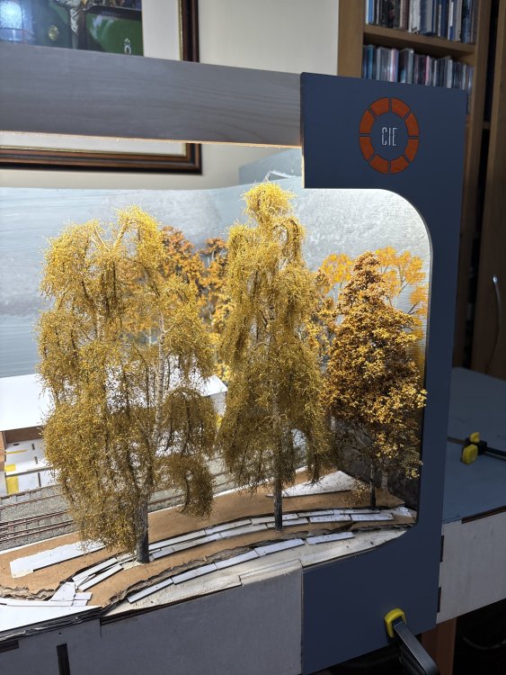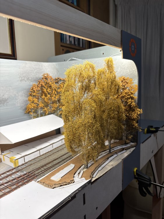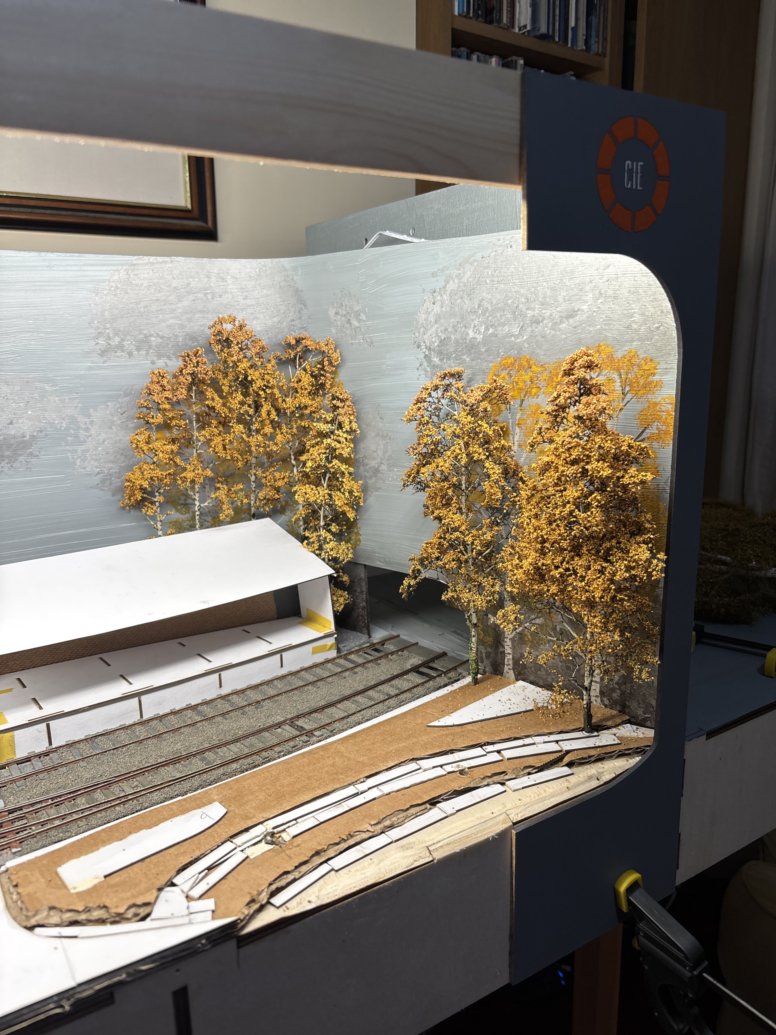 I’ve been working on the trees. Finally got all the foliage on the sea moss trees and it was time for a trial fit. Firstly with just the sea moss trees (and the painted ones on the backscene). There are two larger ones in the foreground and 5 smaller ones in the corner: Then adding the two larger Primo trees I bought: They’re pretty good at concealing the hole in the backscene that the trains come through: But if you crouch down a bit you could still see the trains: I may add some more undergrowth to help hide the hole in the sky from this angle. There’s already a tendril of ivy on the tree trunk, ready to spread… -