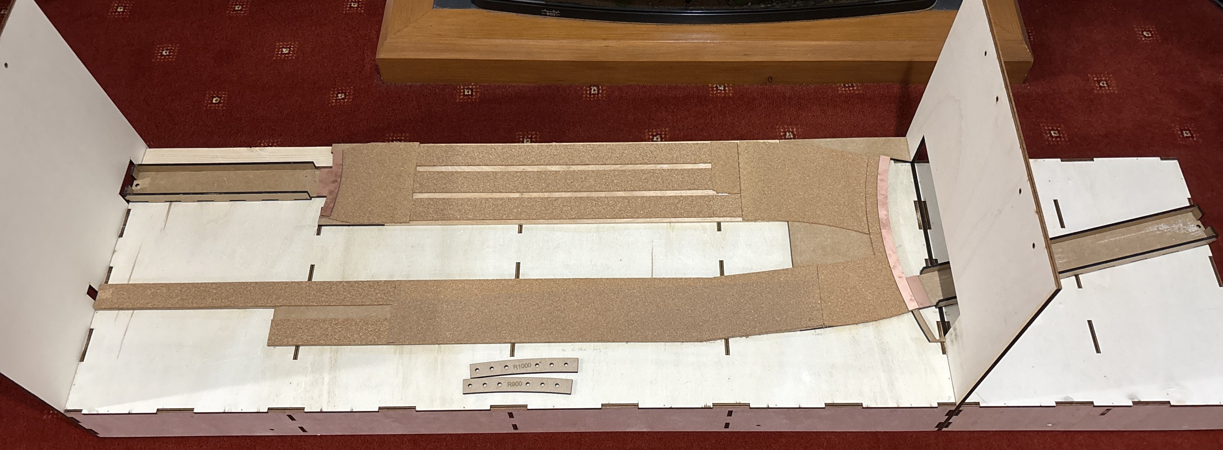 Yesterday evening I put a couple of coats of spirit-based sealant on the whole top surface of the board, with particular focus on the MDF. I rubbed down a couple of high spots and sealed it again. The main achievement today has been cutting the cork layer, and sticking it all down flat on top of the MDF. Once that had all dried under a lot of weight, I reassembled the boards: I've also laser-cut some curved bits: the sector plate ends are cut from copperclad strip, plus a couple of curve radius templates to assist with tracklaying. The next step is to set up the sector plates properly with their pivots and some plastic sliding plates for them to rest on. Then I can mark out the final track alignment and perhaps even start laying some track! -