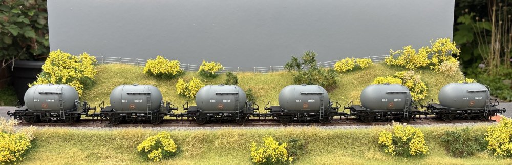 Thanks to ebay and @Stoby of this parish, I now have a full set of IRM grey bubbles - only two packs were produced in this livery: From left to right, we have 25069, 25083, 25084, 25109, 25159, 25187. All the IRM bubbles are the same moulding, which accurately represents the later batches (delivered in 1970-1972), but the early grey ones had some detail differences. Of course there's nothing I like more than destroying the value of collectable models by modifying and weathering them, so I'll be working on these fairly soon to back-date their details. The brakes are the biggest difference but there are many other detail adjustments needed. And of course I need to re-gauge them which isn't so straightforward on these early IRM models. In preparation for that I've been reviewing the available photos of grey bubbles and I thought I'd just summarise the findings here (some of it repeats links earlier in this thread, but I have found some more). As correctly modelled by IRM, the 'BULK CEMENT' lettering is white on the grey bubbles, which helps to distinguish the grey livery in black and white photos. There's also the date as a clue, of course. In the IRRS archive, a photo at Inchicore dated February 1964 with what must one of the first bubbles, still in primer I think: https://www.flickr.com/photos/irishrailwayarchive/53505734117 From the NLI O'Dea collection, a bulk cement train (mix of 1964 and 1965 batches) at Straffan in 1965 https://catalogue.nli.ie/Record/vtls000306759 From the IRRS archive, two photos of a pair of bubbles at Boyne Road in 1966. The nearer one is 25074 of the 1965 batch, and the other is from the 1964 batch: https://www.flickr.com/photos/irishrailwayarchive/53508783939 https://www.flickr.com/photos/irishrailwayarchive/53508466241/ From the IRRS archive, a bulk cement train at Hazelhatch in 1966. The wagons are a mix of the 1964 and 1965 batches: https://www.flickr.com/photos/irishrailwayarchive/54327467196/ From the NLI O'Dea collection, a photo of 25062 (1964 batch) at Derry in 1967 https://catalogue.nli.ie/Record/vtls000307375 From the NLI O'Dea collection, a bulk cement train (the nearer four are all from the 1965 batch, including 25083) at KIldare in 1967 https://catalogue.nli.ie/Record/vtls000306704 From the NLI O'Dea collection, a bulk cement train (mix of 1964 and 1965 batches, possibly the two clean ones at the front might be 1967 batch?) at Hazelhatch in 1967 https://catalogue.nli.ie/Record/vtls000306218 Other NLI and IRRS photos with distant views of bulk cement trains in 1967, few details visible: https://catalogue.nli.ie/Record/vtls000306208 https://catalogue.nli.ie/Record/vtls000306209 https://catalogue.nli.ie/Record/vtls000307373 https://catalogue.nli.ie/Record/vtls000306207 https://www.flickr.com/photos/irishrailwayarchive/53570455706/ https://www.flickr.com/photos/irishrailwayarchive/53447301180/ https://www.flickr.com/photos/irishrailwayarchive/54257011099 From Ernie on Flickr, a super pair of colour photos at Belfast GVS in April 1967. The wagon immediately behind the locos is 25068 (1964 batch) and the remainder are a mix of the 1964 and 1965 batches: There's also a colour photo of a grey bubble at Derry in 1967 in the 'UTA in Colour' (Young) book, page 66 Another colour photo in the IRRS archive showing Cabra in February 1968. Only 3 bubbles are visible, all rather distant but all grey: https://www.flickr.com/photos/irishrailwayarchive/53510447552/ A black and white photo of Cabra also in 1968: https://www.flickr.com/photos/irishrailwayarchive/53511485009/ So then, we've got up to the year 1968, and very confident that the 1964 and 1965 batches carried the grey livery initially. Not so sure about the 1967 batch based on the evidence above, many of the photos pre-date their construction. Can anyone confirm? I haven't found any bubble photos dated 1969, but there are lots of them in 1970, maybe because they changed colour. In June 1970, here's 25129 of the 1970 batch being painted for the first time. Most of the tank is still in primer, with its delivery address stencilled on and even bearing the name of the ship it crossed the water on! But the tank is being painted orange and the underframe grey. So the 1970 batch never carried the original grey tank and black underframe livery: https://www.flickr.com/photos/irishrailwayarchive/53570447106 But it wasn't just the new ones that were orange. Here are 25051 and 25053, from the 1964 batch, each with a coat of orange in May 1970: https://www.flickr.com/photos/irishrailwayarchive/53510419397/ https://www.flickr.com/photos/irishrailwayarchive/53511314086/ From Jonathan Allen on Flickr, a whole train in orange in October 1970, and this includes wagons from the 1964 batch as well as newer types: Again from Jonathan Allen, this rake contains 1964, 1965 and 1967 or 1970 wagons in orange, photo dated December 1970: By the early 1970s everything was orange: So, it seems that there was a major (and surprisingly rapid) repainting campaign in 1969-1970, the older wagons becoming orange, and the newly built wagons in 1970 and 1972 entering service in orange. That sets my grey rake firmly in the 1960s, and requires me to back-date the details to the 1964 and 1965 batches, maybe also the 1967 batch as I haven't quite confirmed if they entered service in grey or orange.