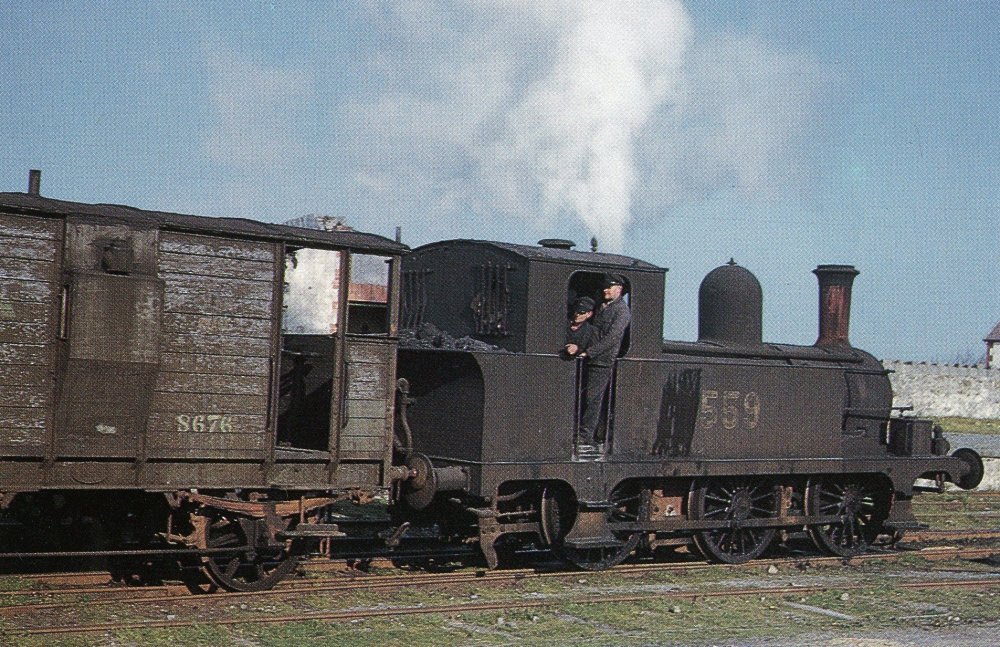 There are plenty of photos of ex-MGWR 0-6-0T 560 at Fenit, mainly because it hauled a railtour there, full of gricers with cameras. There are also a good number of photos of 560 at Tralee, shunting wagons, and 560 is mentioned as the regular steam loco on the Fenit branch in the late 1950s and early 1960s. I'd found no mention of other members of the class. Whilst trawling my books for wagon photos, I've just stumbled across this photo of 559 at Fenit in 1960, along with a rather nice old brake van. While 560 was modified for the W&T with an enlarged cab and narrower footsteps, 559 retained its original cab and footsteps: The photo appears in 'Irish Railways in Colour - a second glance' (Ferris) and is credited to Des Fitzgerald.