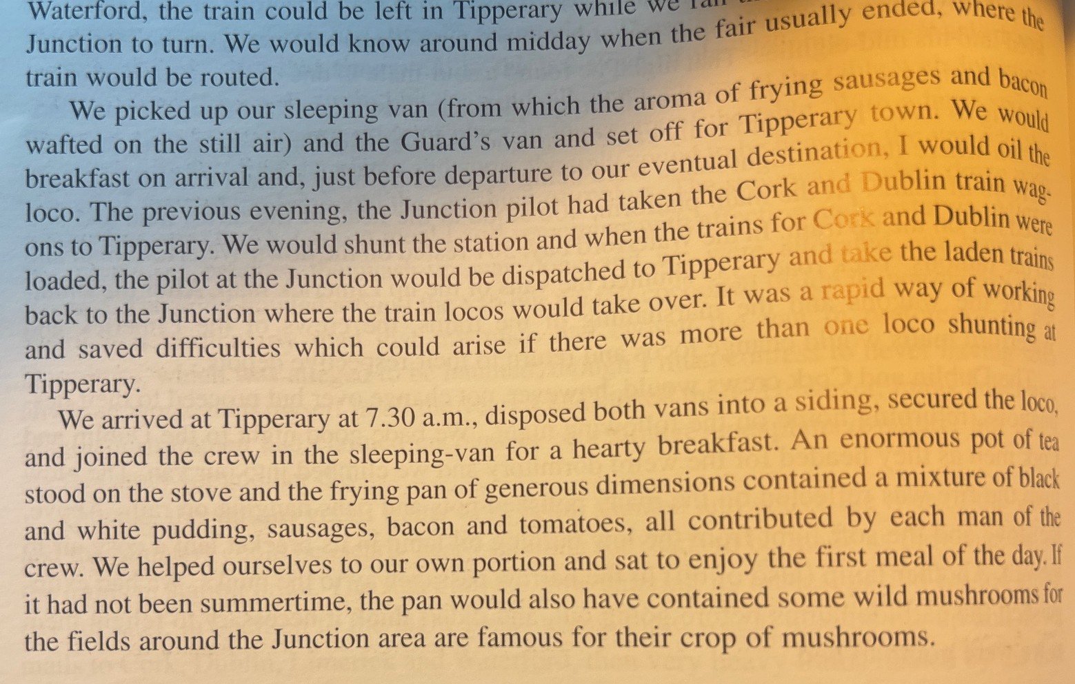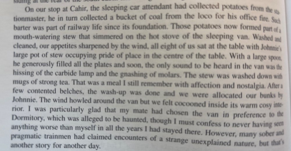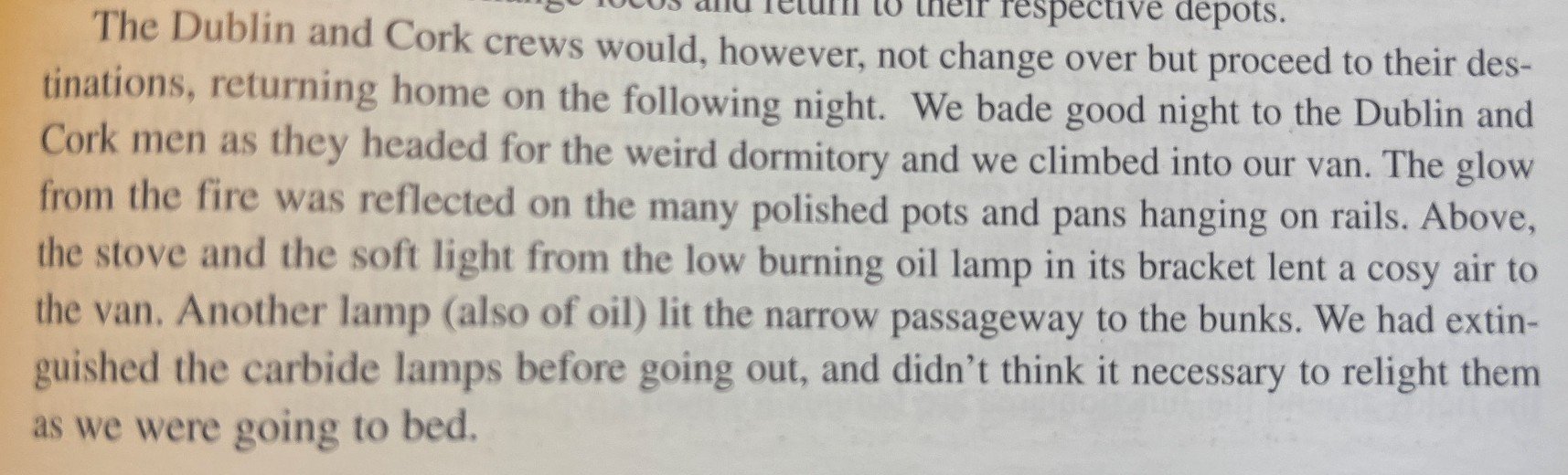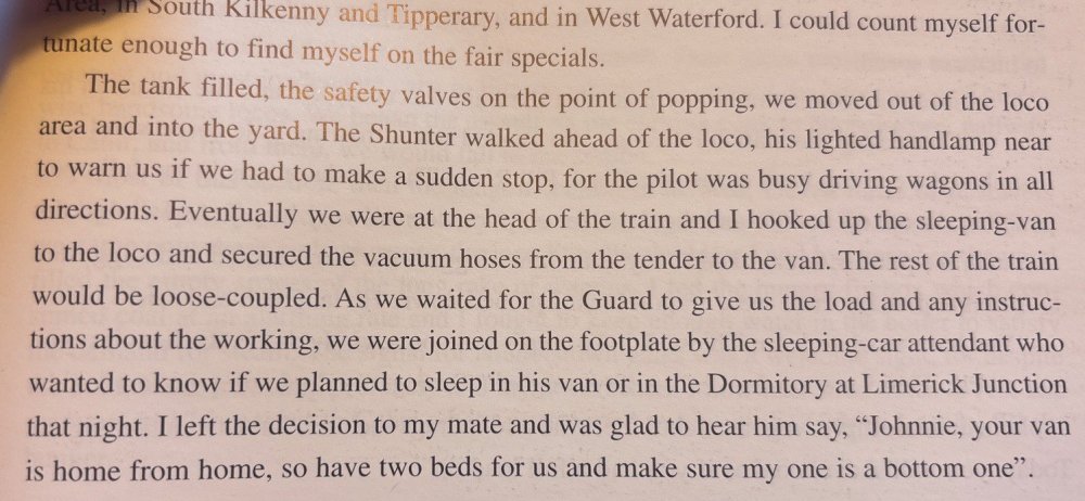 I'm presently reading the book 'Engines and Men - Irish Railways: a View from the Footplate' by Jack O'Neill. Books of steam-age footplate reminiscences are ten-a-penny in GB, but Irish examples are scarce and this one is well written and interesting. It contains a chapter describing the working of fair specials, and from it I got a much better appreciation of how the sleeping cars were used. I've photographed a few of the relevant paragraphs from within this tale as I think they are a useful addition to this thread of sleeping cars. These aren't consecutive paragraphs - if you want to read the full story then you'll need to buy the book! After an evening in the local pub... next morning...