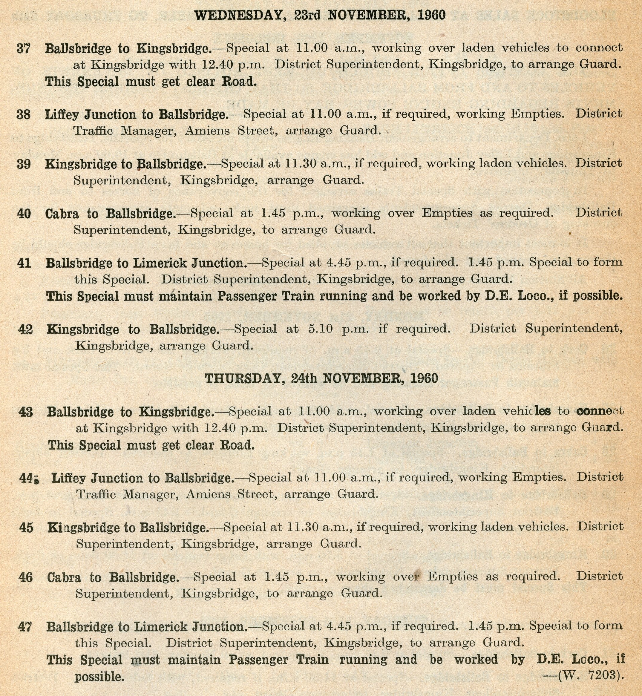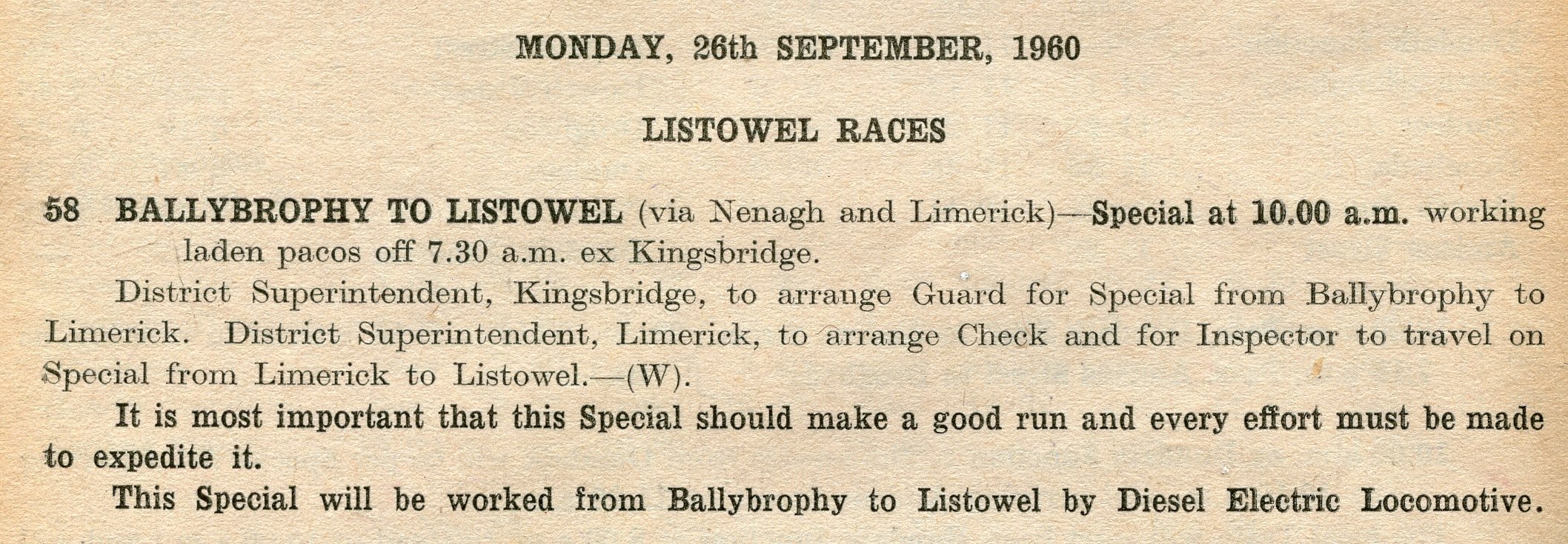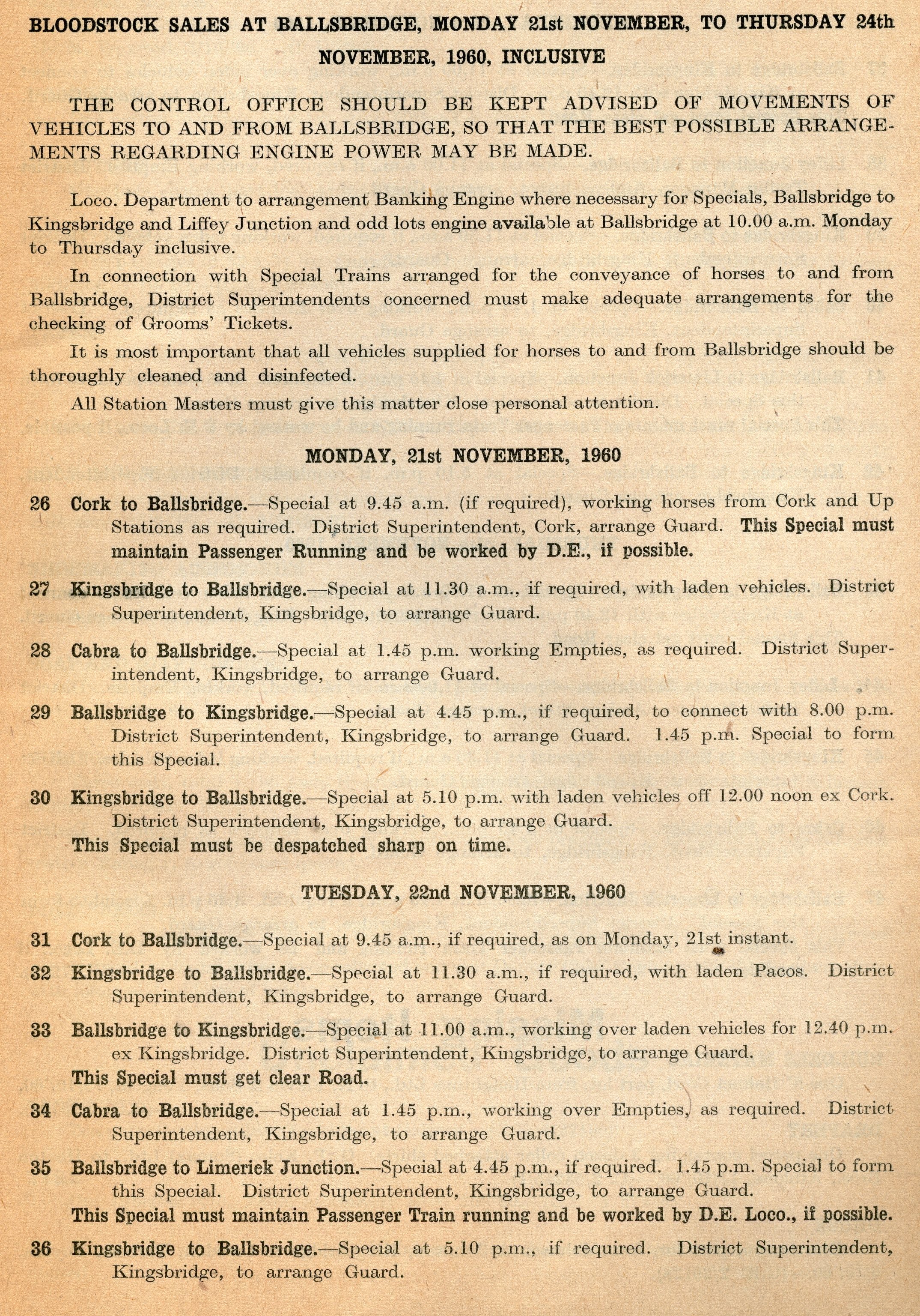 A few more snippets on horseboxes. Firstly, a nice print I acquired on eBay recently showing J26 561 and a matching MGWR horsebox of the later type, in 1950: I also bought a few weekly operating notices on eBay recently, dating from late 1960. Here are some details of a horsebox special to Listowel races: And a much more extensive set of special trains associated with the bloodstock sales at Ballsbridge: