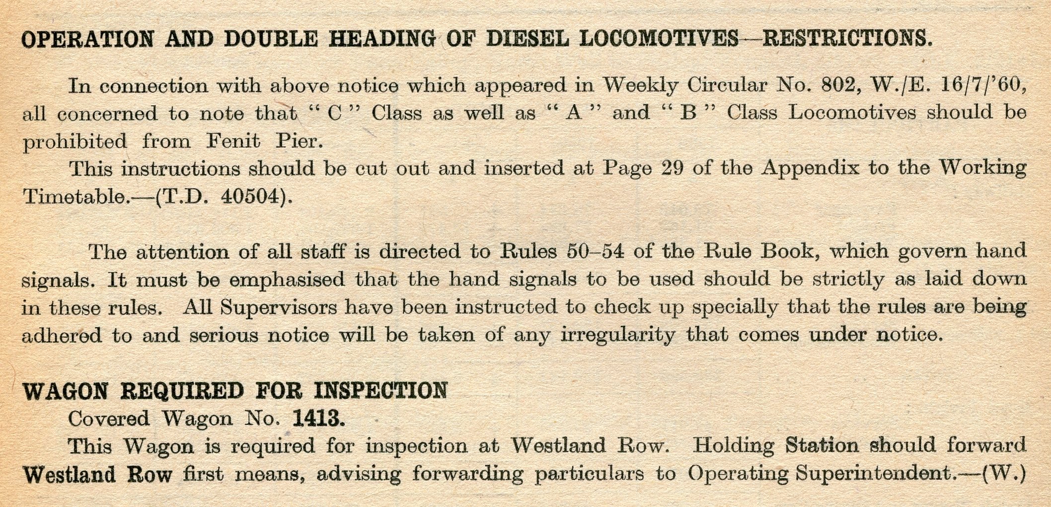 Found in the weekly operating notice for the week ending Saturday 15th October 1960, the official prohibition of C class locos from Fenit Pier: Of course this means that prior to 1960, they could potentially have been used on the pier. Whether it ever happened is another matter, probably not.