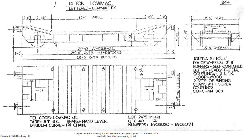 Having done some research, here's a little more info on the CIE lowmac (low machinery) wagons. Pender & Richards (1967) list: 23959-23962, Machinery, 20 ton capacity, 26'6" length over headstocks, built in 1954. 'Machinery Wagons...The four-wheeled wagons built in 1954 are to the same design as two built by the GSR in 1925'. Pender & Richards only list CIE-built wagons, and there are 4 of them, plus 2 GSR, suggests a total of 6. The 1975 CIE working timetable lists: 23957-23962 Machinery Truck, 20 tonnes capacity, 12 tonnes tare That's a total of 6 and suggests that the GSR wagons were 23957-23958. They do not appear in the 1985 or 1986 working timetable listings. Nor do they appear in the 1979 or 1981 Doyle&Hirsch stockbooks. I think this is because they were renumbered into the internal use series with the A suffix. The very first photo in this thread appears to show 649A, also mentioned in the thread above are 645A, 650A, & 651A. Intriguingly, the range from 645A to 651A represents seven wagons, not six. Here are some links to more photos on Flickr; only IRRS members will be able to see these in the IRRS archive. One of the GSR pair in the late 1920s, carrying a damaged ballast hopper wagon: https://www.flickr.com/photos/irishrailwayarchive/53813126331 23958 in 1969, with plain bearings and older buffers: https://www.flickr.com/photos/irishrailwayarchive/53511648559 A couple of photos of one carrying a yellow and black mobile crane in 1976: https://www.flickr.com/photos/irishrailwayarchive/53511728140/ https://www.flickr.com/photos/irishrailwayarchive/53511296761 A series of photos with one carrying a blue mobile crane in the 1980s: https://www.flickr.com/photos/irishrailwayarchive/53526421602/ https://www.flickr.com/photos/irishrailwayarchive/53527462883/ https://www.flickr.com/photos/irishrailwayarchive/53526383912/ https://www.flickr.com/photos/irishrailwayarchive/53527462893/ https://www.flickr.com/photos/irishrailwayarchive/53527285271/ 650A at Inchicore in 1986, with a load of alternators: https://www.flickr.com/photos/irishrailwayarchive/53509017991/ The livery appears to be black in all these photos; only the Gordon Hawkins image in an earlier post is red-brown. The Dapol Kitmaster (ex-Airfix) plastic kit for a BR diagram 2/244 'Lowmac EK' is a pretty close match to these wagons in style, shape and size. The Irish wagons were a foot longer, probably a little wider, and there were detail differences, but it's not bad: Hope that helps and inspires? Mol