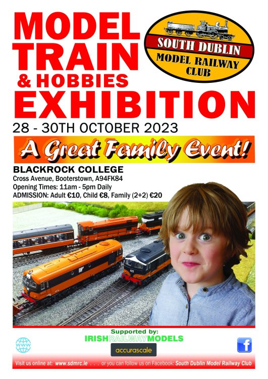 Evening All, To Avoid any confusion I am posting the list of Exhibitors and Traders attending our show here as a separate topic: Here is a list of Exhibitors and Trade stands (in no particular order) attending our show this year in Blackrock College 28th,29th & 30th of October, Sponsored by Irish Railway Models. List of Exhibitors, 28 – 30 October, 2023 SDMRC Exhibition – Blackrock College Exhibitors South Dublin Model Railway Club - ‘Kildare Town’ - OO scale Irish Layout North Down Model Railway Society - ‘Molesworth’ - OO scale Layout Dave Wynne - ‘A Glimpse of Austria’- HO scale Layout Robert Chester – BR Diesel Depot - OO scale Layout Irish Railway Record Society – Photographic Display Mark Adamson - N scale European Layout Ulster Model Railway Club – ‘Galloway Road’ - OO scale Scottish Layout Nicky Cox – Dioramas of Irish themed Railway settings Adam Berry – OO scale Layout Wayne Thomas – Irish OO scale Layout John Dooley – OO scale Layout Adrian Jackson – Ado's Model Buses Xenofon Chatzidimitriou – Diorama of scratch built 1/24 scale Lisbon Tram Derek Farrelly & Jim Poots – Model Buses, kits and paints John Keenan – Model Buses display David Rowe – Model Buses display and sales Railway Preservation Society – Promotional Display Wexford Model Railway Club – ‘Scullt’s Dock’ – OO scale Irish Layout Model Railway Society of Ireland – ‘Ardmore’ O gauge layout T-Trak – Large Modular N scale Layout MERG – Developers of Electronic control devices for Railway modellers Herbert Alexander – ‘Over The Hill’ – Compact OO scale Layout O’Dunlaing Family – Large LEGO display Dave Bolger – Dublin Model Car Club Display of RC racers International Plastic Modelers Society – Display of their models Bill Garrioch – ‘Carrickfinn’ - OO9 scale Donegal Layout FREMO – Large Modular HO scale Polish Layout Dougal McFarlane – ‘Morceaux’ – HO European Tram Layout South Dublin Model Railway Club – ‘Belle Eclaire’ HO scale French/European Layout South Dublin Model Railway Club – ‘Mittenwald’ Small HO scale European Layout Irish Guide Dogs for the Blind – Sales to generate funds to Irish Guide Dogs Trade stands Des McGlynn – Models and Book sales Times Past – Model Railway Supplies Mark’s Models – Everything for the hobbyist. Murphy Models – Latest OO Irish release updates Provincial Wagons Sales/ Richard McLachlan brass kit building demos Dave Linfield – Model Railway Baseboards and Sales Brian Collins Enterprises & Martin O’Hanlon – Sales Chris Dyer – OO Scale Irish Model Sales Una O’Grady – Everything for Dolls Houses Tailte Tours – Railway tours in Ireland Railway Preservation Society of Ireland - promoting and supporting railway preservation in Ireland Downpatrick and County Down Railways Irish Railway Models – The Latest in Irish (and UK) Quality Railway Models Margaret Byrne – ‘Top Choice’ Embroidery sales Peter Williams & Friends – Promoting Cavan & Leitrim Railway and Thomas and Friends will make an appearance. Joe Barlow – Model Railway and Scenic Supplies Gerry Murray – Modelling Supplies Ed O'Neill - Irish Retro Poster sales Gabor Evenich – G Scale Models – Modelling Supplies Note: list may change without notice but these are the confirmed attendees at present.