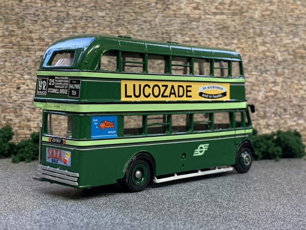 Yet another Adventurous & Brave undertaking which certainly tested by Patience. Amalgamating Resin & Diecast would usually be a "NoNo"! Using a TD5 Resin Body & Chopping the cab area from an EFE Leyland Tiger resulted in a CIE TS11 Decker. Four TS11 Deckers were taken over from the DUTC in 1945 & were instantly recognised by the raked windscreen & lengthened first window bay, all four operating from Conyngham Rd Garage. Modelled here is R244 (ZD 927) on Route 25 - O'Connell Bridge - Lucan, withdrawn & Scrapped By November 1959