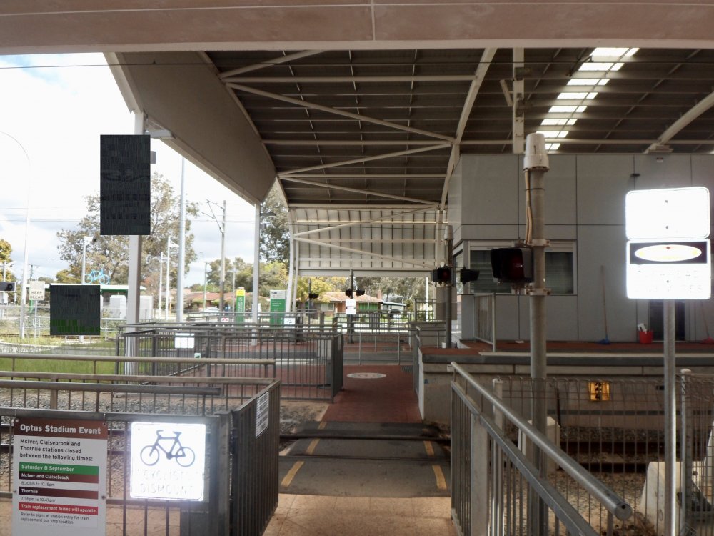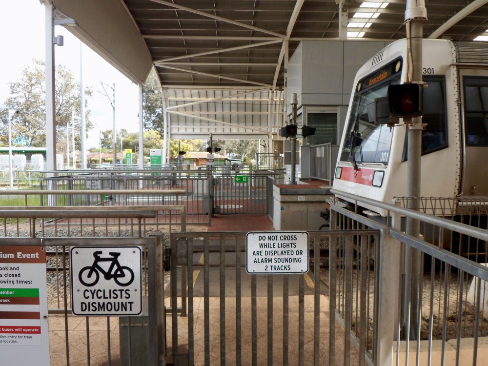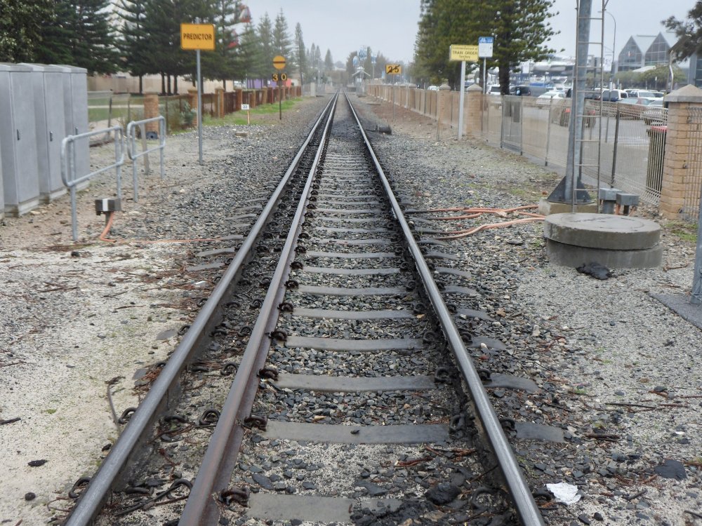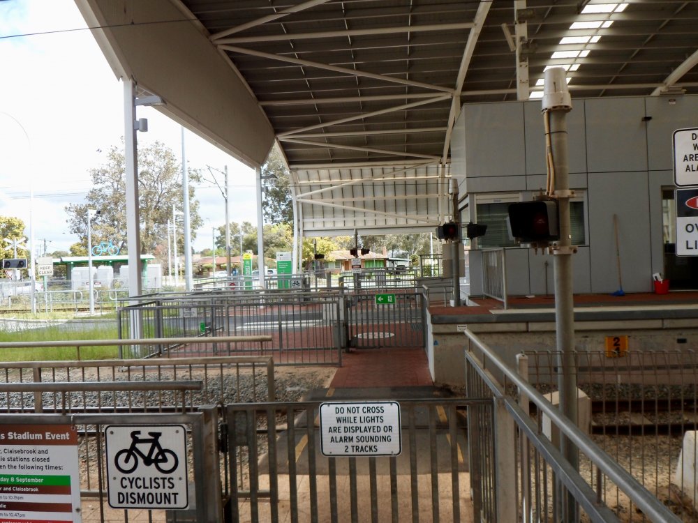 As promised, some pics I took today. When a train is coming, between 60 and 90 seconds a bell rings and the light goes red. Then the gates close. The gates are designed so if you do get caught crossing there is a pen where you can wait safely for the train to pass. It is single track in the pictures as our local station here is an Island but there are double track ones and closer to Perth, stations where it crosses 4 tracks. I understand peoples reluctance to have people crossing at track level. Surely though it makes sense, if operated safely, rather than building towers with lift-shafts and the maintenance that that entails. I can't speak for the rest of Australia or New Zealand as I haven't been (NZ is top of my list to visit) but in Perth the railway is well fenced off with 5ft fences near stations and 6ft fence topped with barbed wire away from stations. The majority of the suburban lines in Perth are Narrow Gauge but there are standard Gauge lines the run over east and to the Port at Fremantle and Kwinana. In some places these are dual gauge and I have included a shot taken from a pedestrian crossing in Fremantle