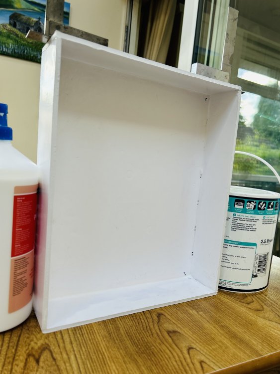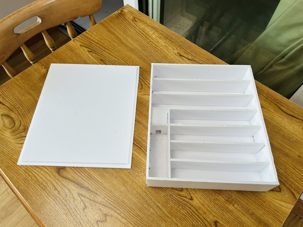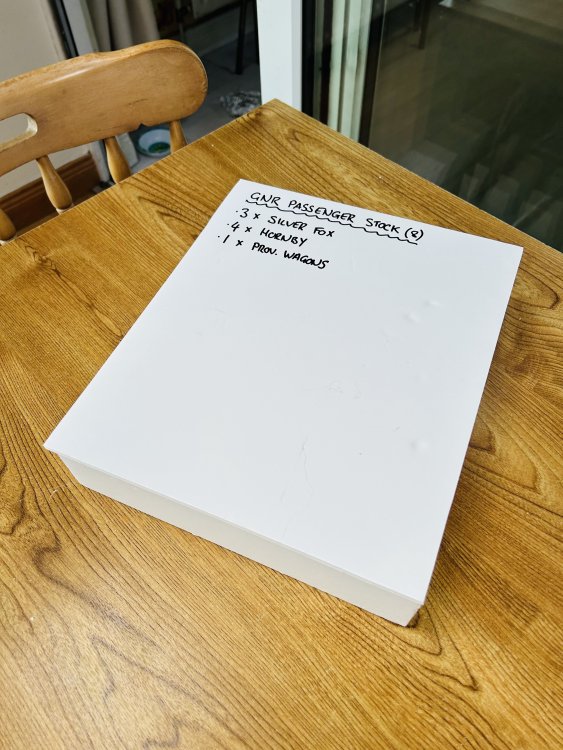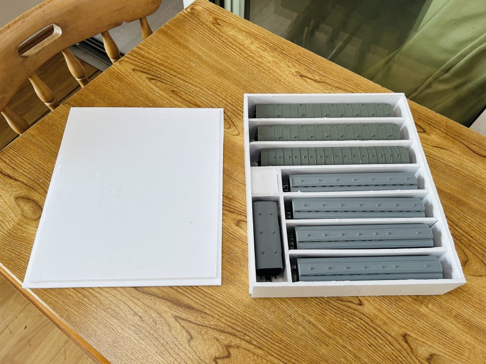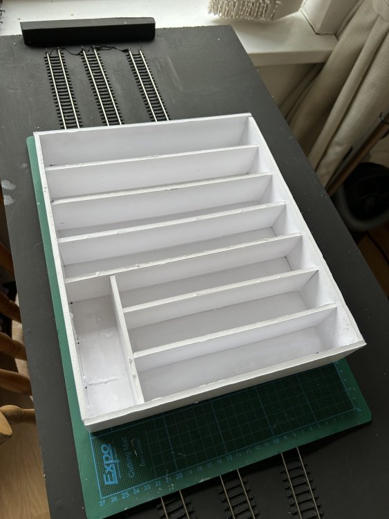 In the interests of balancing insanity with something more normal, here is a simple ‘stock box’ which I made from foam board to store my GNR passenger stock. The material is very light and easily cut, and can be stuck to itself using neat PVA glue. The finished box would not be strong enough to be carried on its own, rather the intention is that this and future similar boxes would themselves be carried inside a much sturdier plastic box.