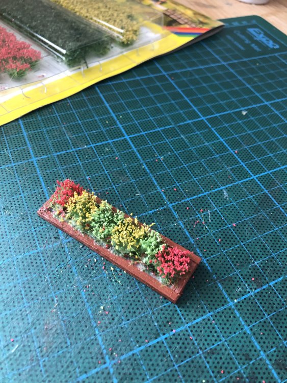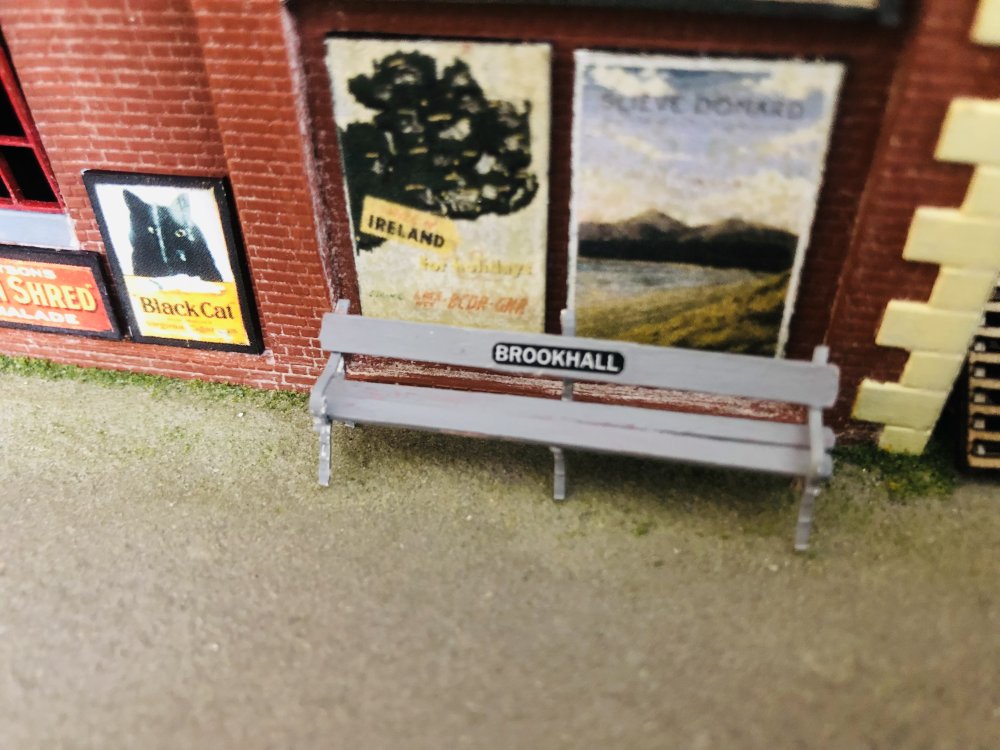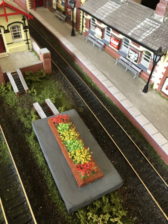 I wasn’t happy with the colour of the benches so I repainted them grey and also found an ideal use for the extra bus destination blinds which I had for my GNR buses. Also picked up some handy flower tufts at the show yesterday so I quickly knocked up a planter for some of them from matchsticks, to replace the one which used to sit on top of the air raid shelter. -