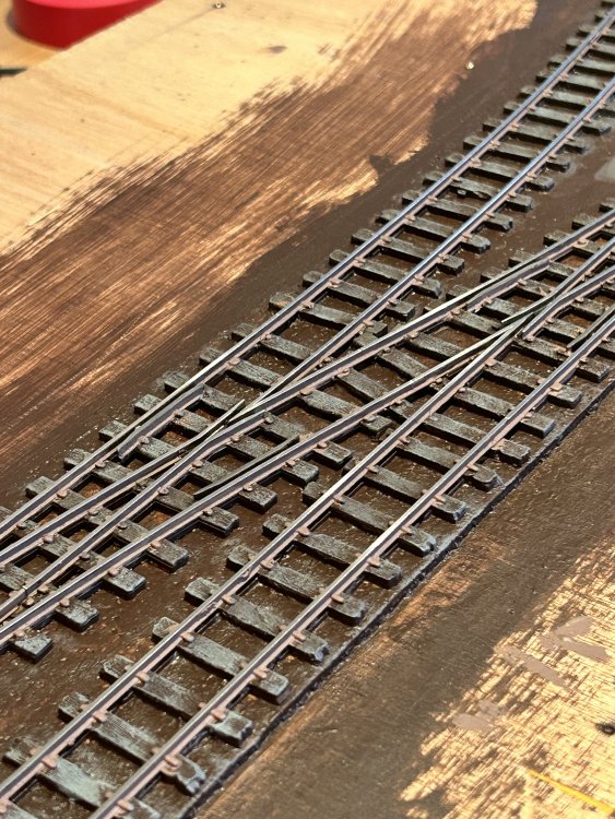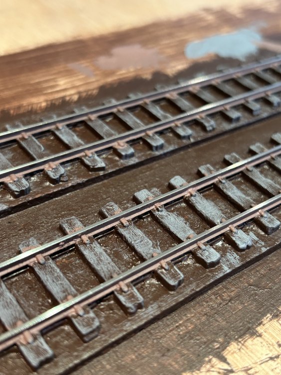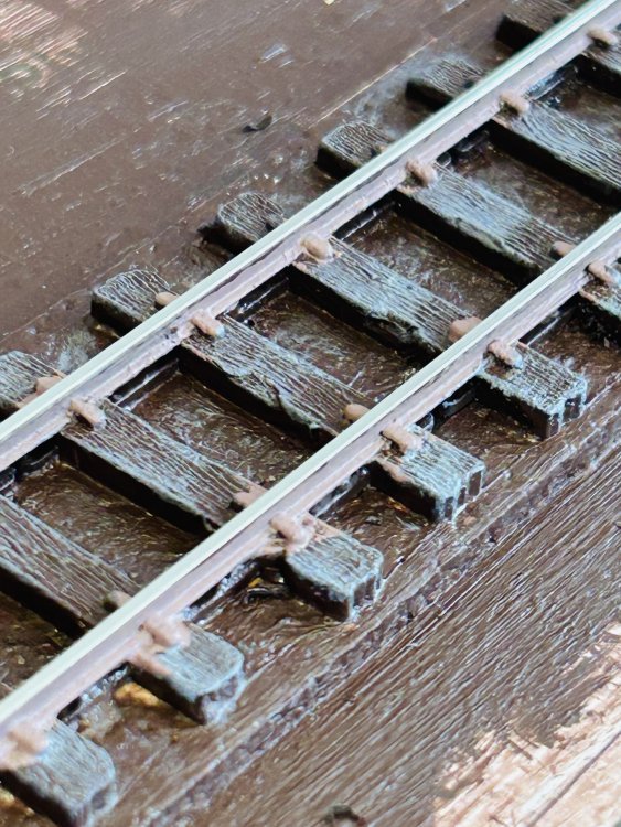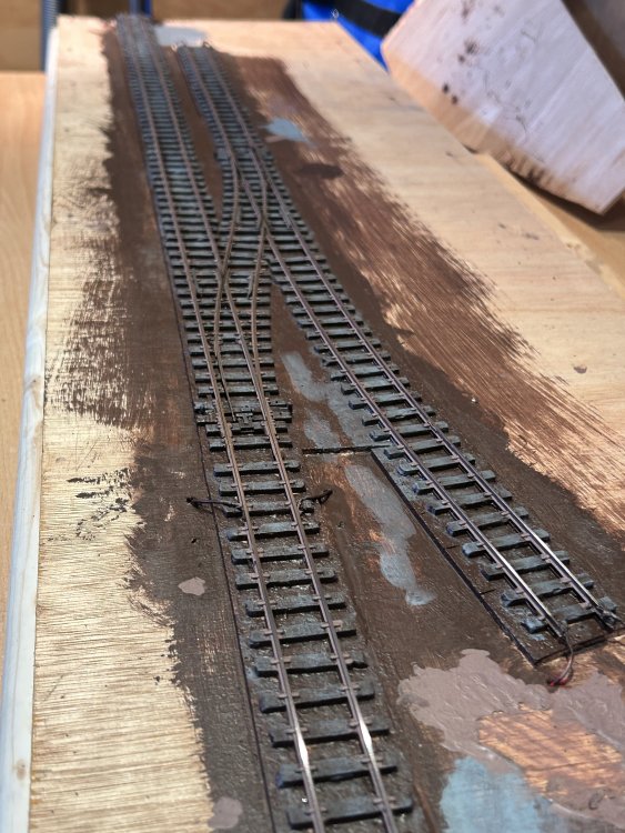 All the track has been wired and painted - dark brown base colour for the sleepers then a dry brush of grey to pick out details, and rust for the rail sides. Then a good run over with the track rubber! I had to order the correct ballast, so no more progress until that arrives. Many thanks to Alan @Tullygrainey for his update on the progress of the chassis for the loco for the layout!