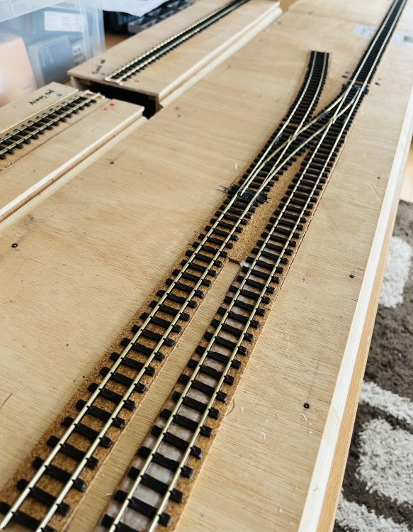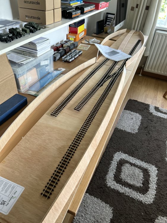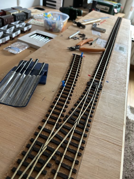 Very kind thanks David All track laid The boards to the left are the short ‘fiddle yard’ extensions. Running line to the left and limestone siding to the right. A big shout out to Alan @Tullygrainey for dropping in to sort the copper sleepers for the baseboard joints Busy work weekend ahead, then next week it will be painting and wiring of the track to look forward to!