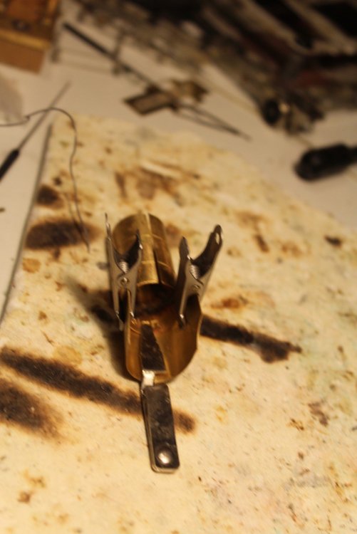 Now to assemble the boiler, firebox (wrappers anyway! and smoke box. The boiler is rolled from brass sheet and firebox formed to shape, the boiler and firebox and smoke box are designed as sub assemblies that bolt together and to the footplate. Preformed boiler and firebox wrappers. I used a strip of scrap brass to simplify joining the boiler and firebox together, a strip of brass will be provided for this purpose in the kit. Reinforcing/jointing strip soldered inside the boiler wrapper. Stainless steel clips to secure firebox wrapper while soldering to boiler. Assembled boiler & firebox wrappers. The disc at the front is used to align the boiler and smokebox wrappers. Riveted smokebox assembly for superheated boiler. The smokeboxes on the saturated locos were shorter and flush riveted with a smooth finish. The smokebox back and front fold up into a box to support the wrapper. A captive bolt is used to bolt the boiler and smokebox sub assemblies together. I used various brass tube and bar of various diameters to preform the smokebox wrapper. Wrapper is attached by working around from one side, using 17 watt soldering iron with small tip and very little solder in a similar manner to the cab roof. Smoke box front attached by sweating, cleaning the soldering iron tip before touching the riveted detail. Starting to look like a loco! I could not resist taking a picture though the chimney and dome are a bit pissed. I have started detailing the loco fitting boiler bands, leading springs and leading splashers, though I still have to sort out the cab splashers. The boiler fittings were lost wax brass castings prepared from my originals by a Morris & Watson a precious metal merchant fabricating and casting business in Auckland. The lost wax castings were also used as masters for the production pewter castings by another business in Auckland