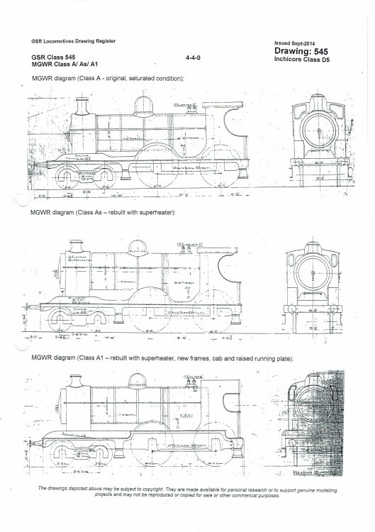 5. According to Clement's & McMahon GSR locos the 1933 rebuild of 546 (formerly 129 Celtic) produced a hybrid combining the wheels of 546, frames and cab of withdrawn 549 and the boiler of withdrawn 646 (J2) O-6-0. The rebuily 546/549 featured the raised running board and canopy cab fasionable in the 1920s also fitted to 548,549,550. The rebuilding of the large MGWR 4-4-0s with superheaters and piston valves from 1917 onwards would have been intended as an economy measure to reduce coal and water consumption. The GSR had a surplus of medium power locomotives following the arrival of the Woolwich Moguls and the effects of the Great Depression, leading to the withdrawl of a number of large MGWR 4-4-0s and 0-6-0 Types. Business appeared to have improved enough by the mid 30s to justify the re-instatement of 546/549 the construction of the 5 342 Class 4-4-0s and the 800 Class. 1948 Inchacore assessment indicates that the As/ D5 Class were mainly used on goods/cattle trains in CIE days and occasional passenger trains in the Cork Area and considered a 'poor design' Comparison of the A Class in its original as built condition and rebuillt form with superheater and pistpn valves. The styling of the raised running board and canopy cab in the A1 version is similar to the final batch of Cattle Engines. Reprints of MGW A.As,A1 weight diagrams issuedwith New Irish Lines Sep 2014