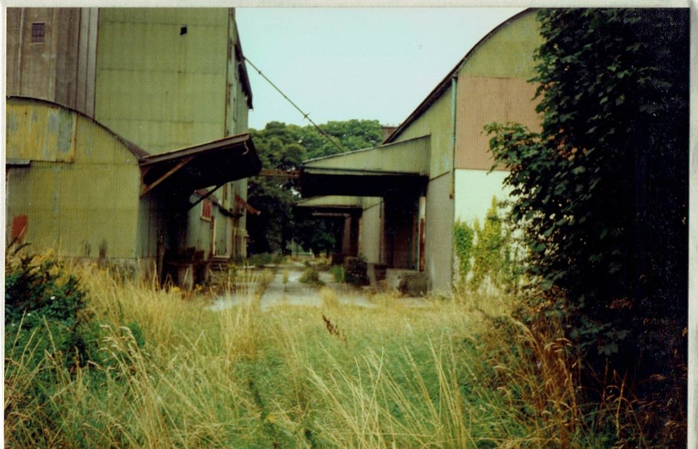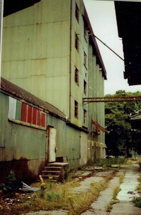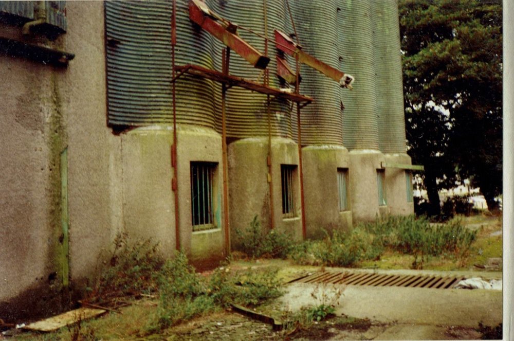 Likely to have been initially loaded under the large Elevators at Dublin, Waterford and Cork ports and unloaded by gravity at mills around the country, apparently wagons were unloaded through a hole in a road bridge in Limerick and the grain then transhipped by road to Ranks Mill in the Docks. There is also a photo (possibly O'Dea collection) of grain being transhipped from a grain wagon to a truck at Fermoy during the 60s using a portable conveyor The GSR originally built 10 hoppers for its own use and 8 for Ranks traffic during the 1930s, the increase in traffic that lead to CIE converting H Vans to grain wagons likely to be tied up with large scale mechanisation of agriculture in Ireland during the 50s leading to increased grain growing and use of grain as stock feed (Anglo-Irish Free Trade Agreement? Ferns County Wexford seems to have become a significant originating point in the 50 with Ferns-Ballysodare possibly Ardee traffic flows. Grain seems to have been stored for loading in a typical Irish curved roofed agricultural/industrial building as opposed to a silo/elevator at Ferns and loaded through covered conveyors that projected out of the building. Some photos of arrangements for loading/unloading at Clara. Built 1930s quite a contrast with stone mills built during 19th Century Ranks Mill Clara 1990s Elevator on left, drystore? on right, seems to have been 2 siding in this area. Mill Elevator on left smaller building may have been for storing finished product animal feed? before dispatch Close up of loading chutes and discharge point. Looks like the discharge point was set up for unloading trucks after rail traffic ceased during the Mid 70s. Clara an industrial town once relatively busy with freight traffic mainly tied up with the Goodbody family. Jute mill served by a long siding west of the station and Goodbodys later Ranks Mill at the rear of the station and two goods yards with its own pilot loco laterly a G Class