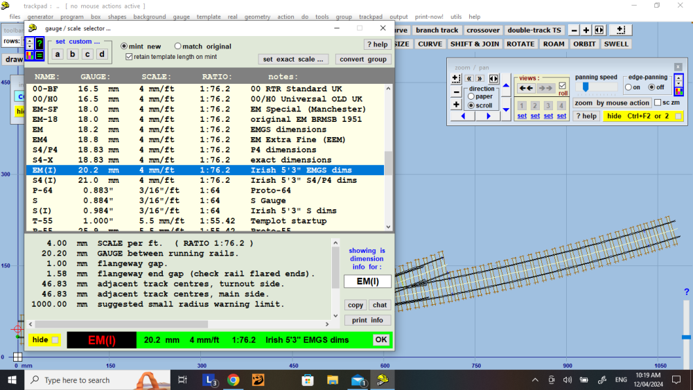An important factor to consider is that Templot uses different track gauges for "Irish 5'3" depending on whether you model to EMGS or S4/P4 dimensions. Specifying a gauge of 20.2 for EM(I) and 21mm for S4 (I) Martins rationale for using a narrower than prototypical track gauge for EM(I) may have been based on providing adequate running clearances for wider than scale wheels in loco and stock bodies in a similar manner to the choice of 18 and later 18.2mm rather than the more accurate 18.83 to model the British Standard gauge during the 1940/50s or possibly Martin simply adding 2mm to EMGS dimensions in a similar manner to Martins subtraction of 2mm from EMGS in advocating 16.2 mm gauge in order to achieve improved running than 16.5 for OO gauge rtr models. -
