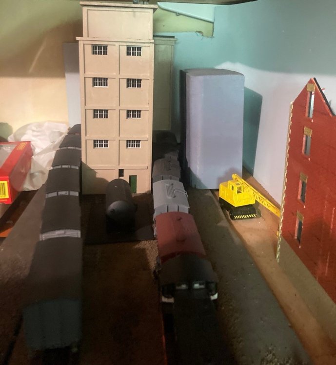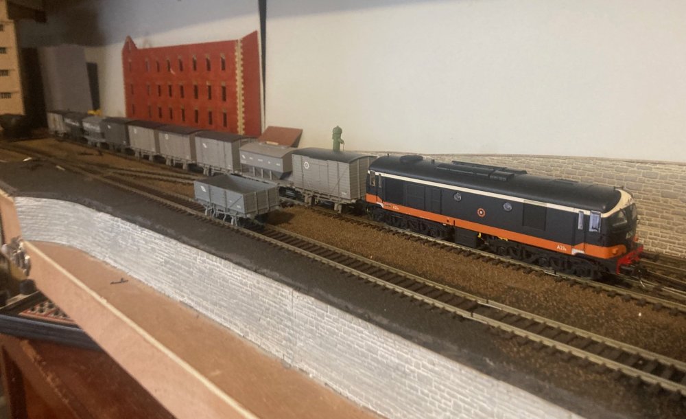 First time I had a chance to operate the layout (play with trains) since June as a result of family commitments, CIE got an order to move another shipload of animal feed that arrived at Northwharf with the line open to wagon load traffic as-required. The yard is basically full of wagons! Local yard staff and train crews had hard words with Motive Power Control and sent a B121 after an A Class buffer locked running round wagons on the last grain special. The B121 is positioning bulk grain wagons for loading from the elevator, with hard topped wagons for bagged feed. There is a lot of shunting involved as only 2 wagons of bagged and 1 bulk grain wagon can be loaded at a time! The grey object behind the crane is a 3D print of an American elevator that took the best part of a day to print and punctured the printer p.f. film fortunately without destroying the printer LCD screen (the joys of home 3D printing) I am planning to build a dry-goods store in this area corrugated cladding and curved roof similar to Ranks Clara to fill the area between the old brick Maltings building and the elevator. The G Class dropped her guts (as been known to happen) and the B121 took over the shunting of laden H Vans between the mill and yard tracks. "Edward" and his handler moved the empties one at a time from the headshunt to the Mill. Its probable that wagons may have been used by capstan (rope) power on the Wharf siding though a modified tractor is likely to have been used by the late 60s, though a shunting horse would make a nice scenic feature. The wagon by the mill is a cripple (no couplers) and Edward go the gig because I seem to have mislaid my Hornby Peckett which is concerning. B125 with her train made up and ready to depart leaving Northwharf to slumber until the boat comes in. For me the real draw back with the layout, is that I can only run very short trains because of the restricted space (7'6")
