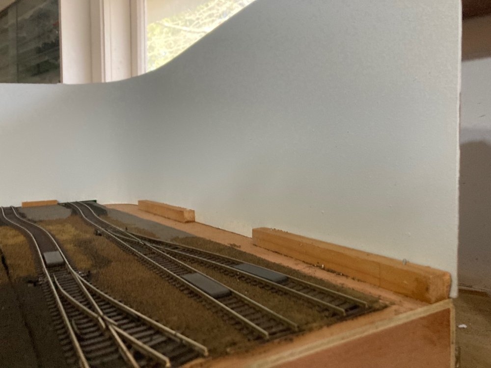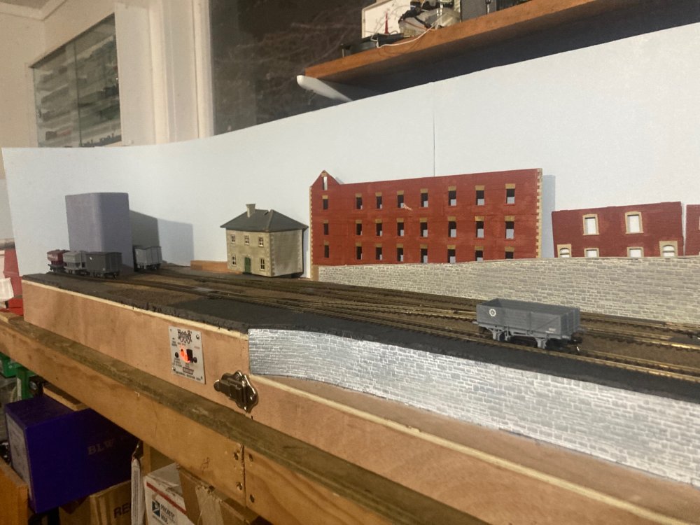 Having done nothing with North Wharf since February I painted the backscene with a "sky" blue undercoat and hooked up the radio DCC system, mainly because I need to move the layout out of the workshop/layout room to the home office! I will fit view blockers, fascia and pelmet once I complete the scenic works and possibly buildings The small Digitrix panel is a Radio/Infra-Red receiver allowing "hands free' operation with loco(s) and points controlled by DCC, remoter uncoupling with Kadee couplers and uncoupling magnets. I still need to finalise the buildings and structures in the Granary end. Complete terrace of houses between maltings and overbridge with semi-low relief malting building in corner behind bridge. The traverser/fiddle yard restricts train length to a small loco and 4 wagons. Baseboard end view showing DCC-Concepts baseboard alignment dowels and power connector (track and point power). The blue mixed at the local DIY store came out very close to the existing (2012-4?) backscenes. Backscenes screwed to stripwood strips.