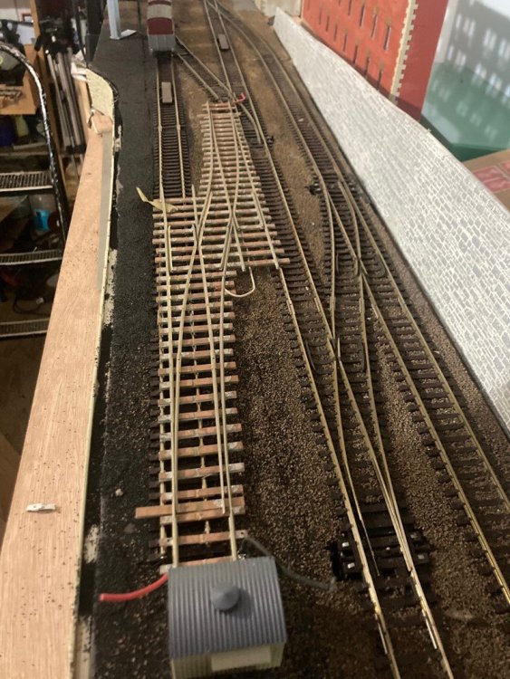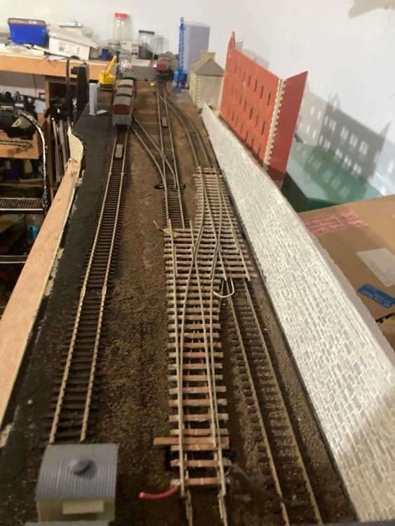 I thought it would be useful to add a re-gauge of the MM Baby GM and and a comparative space required for pointwork in OO and 21mm gauge. My 21mm gauge work is based on using EM profile wheels and running clearances (back to back 19.3mm) which is a good compromise between S4 and OO wheel profile and running in terms of a trade off between appearance and ease of use. Murphy Models B141 with OO/EM profile wheelsets with 19.3mm back to back gauge. Wheels fit within the MM bogie sideframes without modification. The wheels and 21mm axles were supplied as a custom order by Ultrascale. B141 re-wheeled with original Bachmann wheels and new axles. It is necessary to reduce the thickness of the Bogie Sideframes by grinding/filing to re-gauge the model to 21mm using the original wheels to 21mm gauge with a 19.3mm b-b. Brendan of this parish gets around this problem by setting the back to back to 19mm and presumably using OO gauge running clearances. I body mounted the Kadee's on my baby GMs by removing the coupler pockets from the bogies and gluing to the pilot infill panels supplied with the MM models. A direct comparison between a 21mm and OO gauge crossover. The A switches and No 6 crossing angle is pretty much minimum the minimum for main line locos and stock in sidings and secondary trackage when working to EM or S4 standards. The 21mm gauge crossover is 500mm long the OO Gauge using Peco small radius points 370mm The OO gauge Timesaver layout and traverser fiddle yard occupies a space 2300mm long, I was unable to fit a similar layout with a fiddleyard and run round loop in the same space in 21mm The original 2012 dock layout. The inspiration was the North Wall Granaries area with the Dock lines straight a small marshalling yard for dock traffic on the left with the main running lines curving around past industrial buildings to another yard depot. The main problems were that I could not get the double slips to work and that I did not allow enough clearance between the yard tracks on the left and the running lines. Visually the abrupt transition from straight to curved track did not work, operation was likely to become tedious as I could not stage trains off line without a fiddle yard.