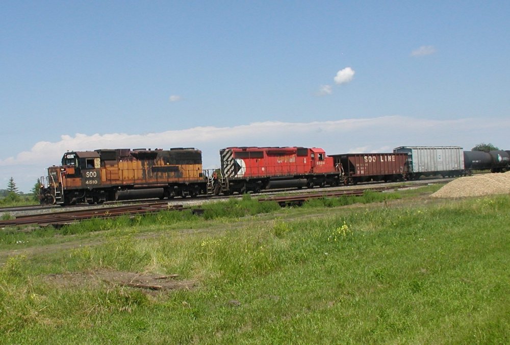 Interesting to see models of SOO ex-Milwaukee Road Bandits I came across an ex Milwaukee "Bandit" GP38-2 but did not realise what it was while visiting relative in North Dakota in 2004. While most of the through trains were hauled by relatively new GE power in the CP Beaver scheme, way freights were worked by locos in CP Pacman & SOO line branding. -