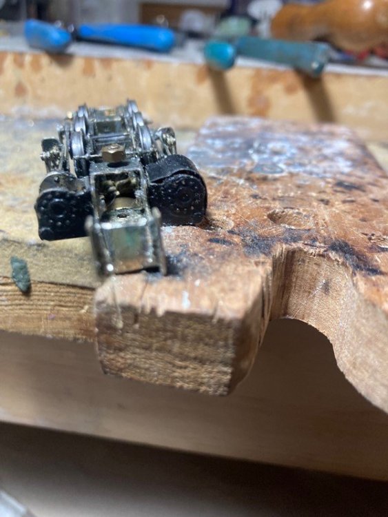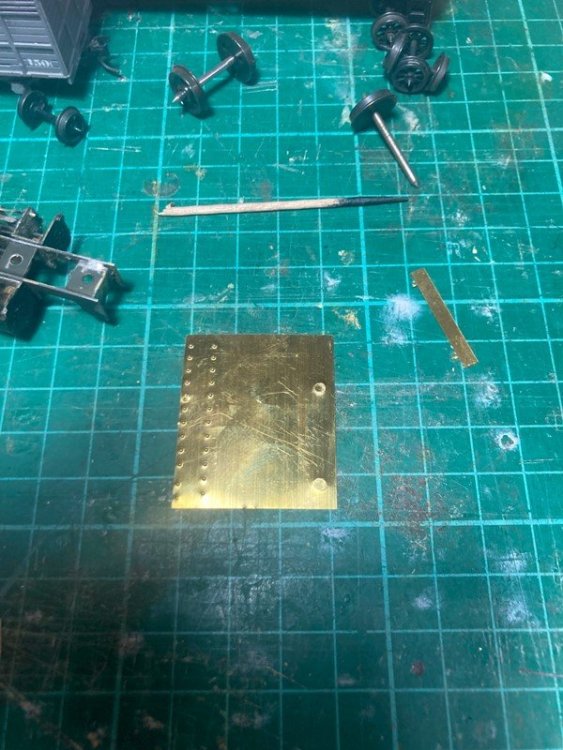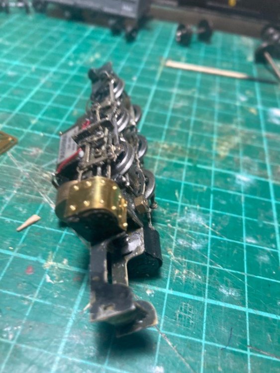 Its a long time since I did any personal modelling, I recently started working on my Irish narrow gauge stock a useful distraction when New Zealand recently went into lockdown. I decided to focus on my narrow gauge stock as most of the locos are due for repairs as they are getting long in the tooth and I have some unbuilt wagon kits. I started with my T&D locos as they do most of the work on the layout. 6T lost one of her cylinder wrappers and the couplers require replacement. Model parts tend to disappear when the fall on the floor so far the chimney from Keadue Goods Shed, a section of wall, a coach roof and one of 6Ts cylinder wrappers have disappeared without a trace despite a thorough search of the floor and under the furniture, our neighbourhood's version of the Bermuda Triangle. A couple of years ago I acquired 4 Foxrock Models C&L Cattle Wagons and 2 C&L Open wagon kits to form a Cattle Special and strengthen on of the Arigna coal trains. The bodies are high quality resin castings with a fairly complex etched brass chassis, the Backwoods wagon chassis although very good are relatively un-detailed by comparison. First job was to dismantle 6T to her main sub assemblies (but not dismantle the chassis!), so I can fabricate a new cylinder wrapper and modify the chassis to fit the new couplings. The new wrapper is formed for a piece of 0.20" brass (kit scrap), the scribed line is the wrapper width. I used a GW Models rivet tool to emboss the rivets, good practice if I ever get round to building a CVR Sharp Stewart 0-4-2T! The marks on the right are from the tools clamping bolts. I cut the wrapper to the correct width using a tin snips gradually cutting away strips parallel to the line the finishing with a fine file much easier than a piercing or razor saw. Cut waste material distorts while wrapper stays flat, one more cut to make before finishing with file. Wrapper dressed in place, I started at running board level dressed the wrapper round the cylinder ends then gradually trimming to the finished length. Starting to look like a loco again wrapped temporarily positioned with Blu-tac. The kit was designed with L shaped frame spacers fore and aft, which leaves insufficient room between buffer beam and spacer for a Kadee HOn3 draft gear box. I had originally fitted my T&D locos with Microtrains N Scale loco couplers which have a short draft gear box that just about fitted, but gave trouble in service. The first step was to partially remove the vertical section of the frame spacers, by first cutting notches with a piercing saw. Then snapping off the vertical section, the notch section cut leaves a narrow vertical section in place at both ends to avoid weakening the chassis. The kit was designed for scale chopper couplers and I had already formed a cut out in the buffer beams for the N Scale Kadees which were slightly widened for Hon3. 6T was overhauled and appears to have been painted black before sending to the C&L in 1957 and ran with a hand written 6T on the buffer not the traditional shaded transfer. Coupling problem seems to be solved, loco and wagons now have matching coupler heights and knuckles! The next challenge is fixing the coupling at the cab end. The chassis fixes to a captive 6BA bolt/stud under the cab floor, it looks like I may have to secure the coupling mount box with a 12BA bolt drilled and tapped into the body securing bolt!