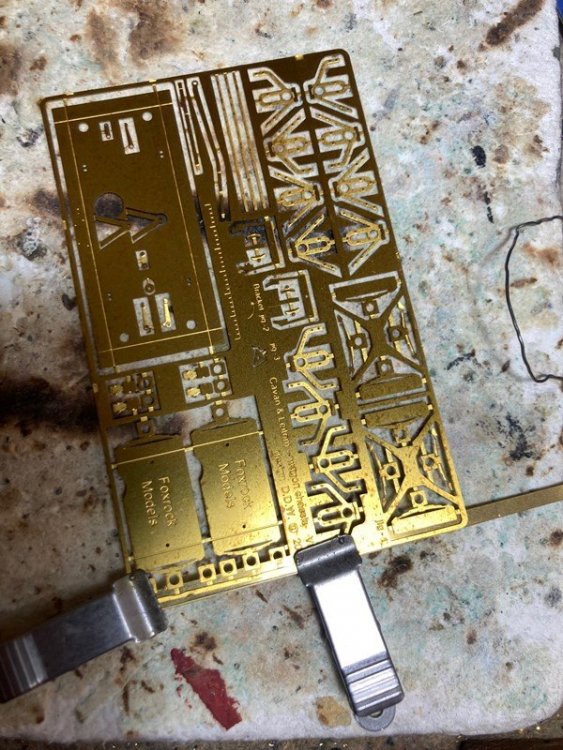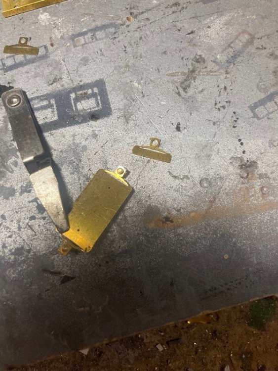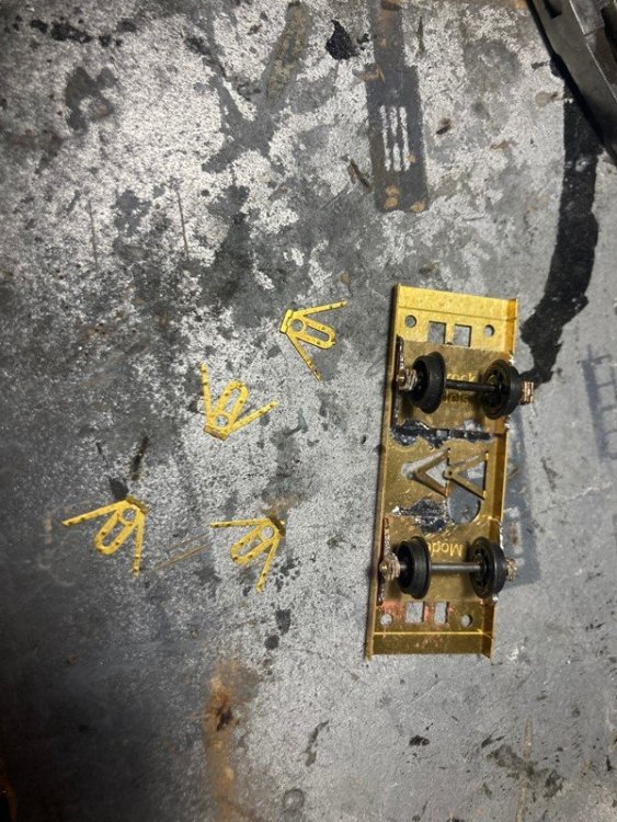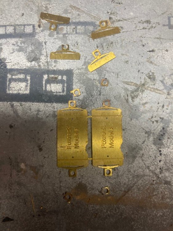 So to the wagon chassis assembly: The chassis kit is designed to capture detail variation that existed between individual C&L wagons and wagon types during the railways history, including variations in wheelbase and ironwork. The first job was to solder a reinforcing strip along one edge of the fret, as recommended in the instructions. The strip minimise distortion while opening out bearing holes & packing pieces(with a tapered to broach) to clear top hat axle bushes. I used a strip of scrap brass, soldering clamps are by Micro Mark. I use phosphoric acid flux (Ranex Rustbuster diluted with distilled water https://www.bondall.com/ranex-rustbuster/ not sure if anything similar is available in Ireland or UK) with DCC Concepts 145° solder. The solder basically runs into the joint by capillary action avoiding blobs of excess solder. Bearing holes opened out and reinforcing strip removed The next stage of the assembly involves assembling a number of small parts. The square washers are packing pieces which fit on the inside of the (not quite) W iron assembly, the packers with spring attached fit on the outside of the W iron assembly I found the simplest way to assemble the units was to solder the bearings and packing pieces to the W irons before folding the units into a U shape. This was easy to do with the fold lines facing down and the bearings facing up, a hot iron flux and minimum solder on the tip of the iron. I then soldered the 2nd layer of the spring/w iron in place. Folded W irons waiting to be soldered to the chassis The chassis is designed for the longer cattle wagons and short opens. Shortened by breaking off at the half etched lines and the solebars by folding. The "W irons" fit between the solebars, the holes in the w irons align with holes in the chassis and can be set up for a 7' or 7'6" wheelbase. I omitted an additional spring axlebox layer which fits below the solebar. The main reason for the complexity. On the Cavan & Leitrim and the majority of Ulster's railways (broad and narrow) wagon the Axleguards were bolted to the outside of the solebars with axleboxes and springs on the inside unlike the "Southern" Companies and the GNR The kit includes 3 alternate sets of cosmetic axleguards to cover the more common variations between C&L Wagons Cosmetic axleguards soldered in place. I will remove excess solder with a fibreglass brush before painting, in this case solder acts mainly as a key for paint. The kit includes axlebox covers and brake gear, but that's another days work! One that I assembled earlier for comparison, I did not realise I used different axleguards on the wagon on the left. The standard of detail, pattern making and casting of the wagon bodies are exceptional for a resin cast model. The resin is quite flexible and delicate parts unlikely to break off during normal handling and use. The C&L had a small fleet of cattle wagons 81-100 that could carry 10 2 year old cattle one more than most contemporary Broad Gauge wagons (13'6"-14') because of their greater length. Wheels are from my surplus stock and may require replacement its difficult to maintain a consistent back to back gauge as they tend to slip on their axles (even with Locktite) I will probably use these wagons for Fair Specials as there is a photo of a train of these wagons is CIE days, 4 and a van is a bit short, 5 and a van just about fits in the fiddle yard.