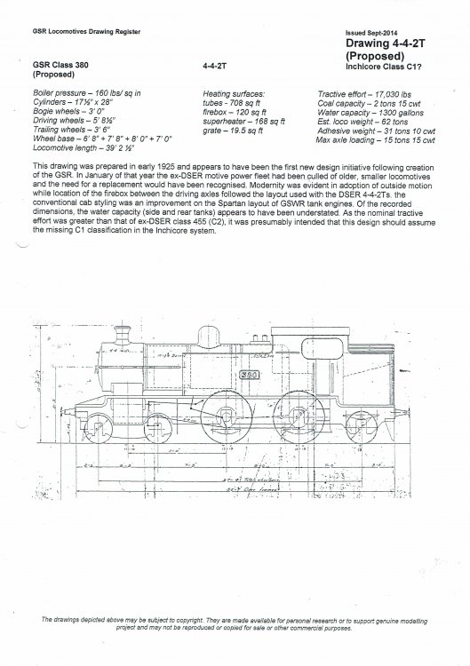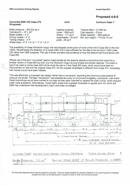 Its possible that the 4-6-2T was a development of a 1925 GSR proposal an outside cylinder 4-4-2T for use on the DSER which eventually emerged as the solitary 2-6-2T 850. The 820 class looks strikingly similar to to original 380 Class proposal with an extended bunker and an additional set of driving wheels, it was proposed to fit the new locos with the O Class boiler which was fitted to the 1936 built 342 (D4) Class 4-4-0s and several similar ex-GSWR 4-4-0 Classes which would have achieved a large measure of standardisation. Its possible the GSR adapted the 3 cylinder drive and 4-6-2T wheel arrangement to produce a smooth rising locomotive with wide route availability. 3 cylinder locomotives were supposed to be easier on the track than 2 cylinder locos with outside cylinders and uncertainty over the stability of a loco with a leading truck at speed. The Woolwich Moguls were notoriously rough riding, 2-6-2T 850 appears to have had a reputation of rolling at speed while both the SR and LNER experienced derailments with locos with leading trucks at speed including the LNER V2 mixed traffic 2-6-2 & SR river Class 2-6-4T. The LNER appear to have resolved the problems with the V2s while the River Class were withdrawn and converted to 2-6-0 tender locos. Its unlikely that GSR/CIE had the resources or could afford to maintain its p.w. to the same standard as the LMS and GWR that extensively used 2-6-2T & 2-6-4T locos on fast passenger services. Interestingly Inchacore developed a proposal in 1945 to "convert" Woolwich Moguls into 3 Cylinder 4-6-0 mixed traffic locos visually a smaller version of the 800 Class. The conversions would have practically have been new locos apart from retaining Woolwich tenders and driving wheels a large boilered 3 cylinder development of the GSWR 500 Class 4-6-0s of 1925 one of the first successful mixed traffic 4-6-0 classes in the British Isles.