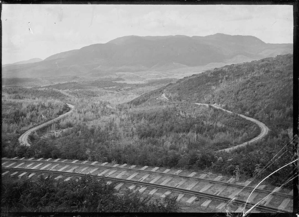 Some more odd-ball stuff. I planned to build an American On30 narrow gauge layout in a garden shed/garage and set up a mock up of one line crossing above another without realising there was once a similar arrangement on the Ongarue Bush Tramway in King Country Bush Tramways or logging lines tended to use a mixture of American and locally designed geared steam locos but no Shays. The locos in the Ongarue photo are AG Price 16 wheelers which are similar in concept to the Type A Climax with the weight spread over 4 bogies or trucks. Although I had a space of 24X12 the On30 layout never got beyond the planning/mock up stage and started to build a permanent American N Gauge layout with a center island as I felt the On30 did not work out in the available space. The Taupo Totara Timber (TTT) company operated the 80Km Mokai Tramway between its mill at Mokai north of lake Taupo and the New Zealand Railways Rotorua Branch. The tramway was worked mainly by Heisler geared locomotives and a Mallet operated through remote country with challenging civil engineering including a corkscrew section and a large single arch bridge over the Waikato. The tramway struggled financially through much of its existence, the bridge got into poor condition and was replaced by a steel structure in the 1930s. The Corkscrew. Most of this area was converted to plantation forestry from the late 1930s a 30Km section of the line was upgraded to serve a pulp and paper mill in the late 1940s after the tramway had ceased to operate, sections of tramway are in use as private forestry roads. -