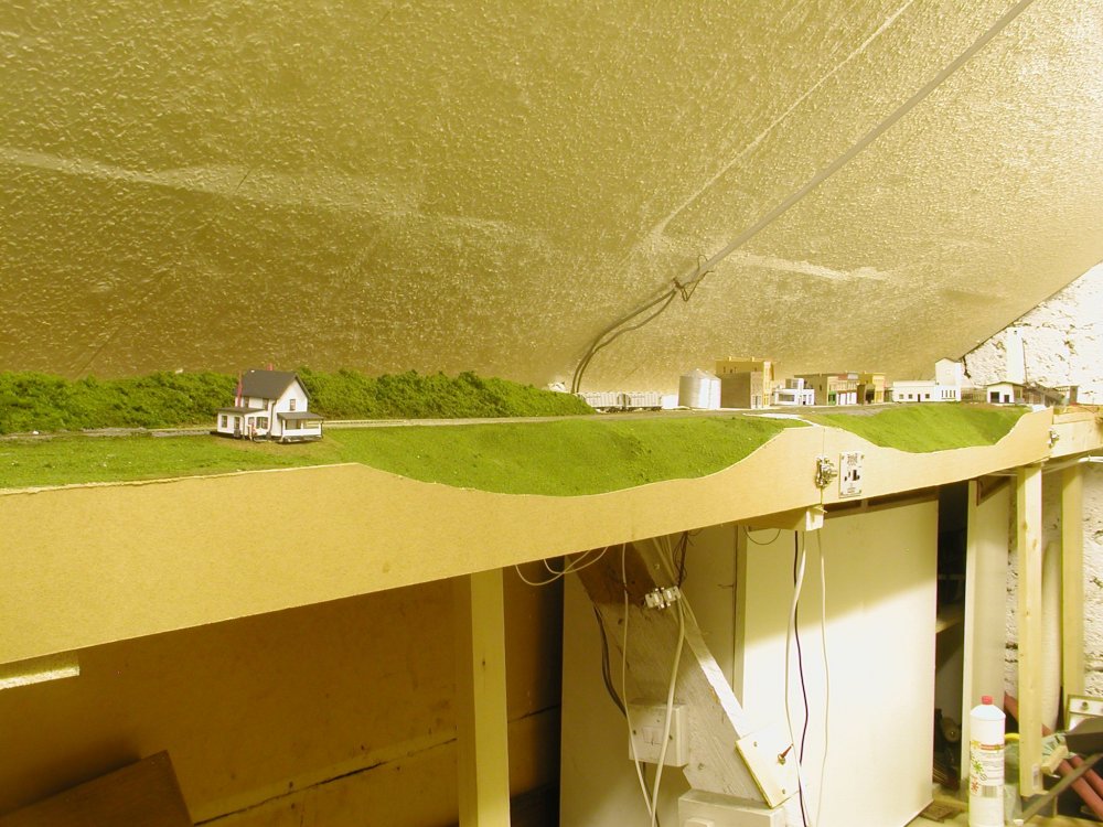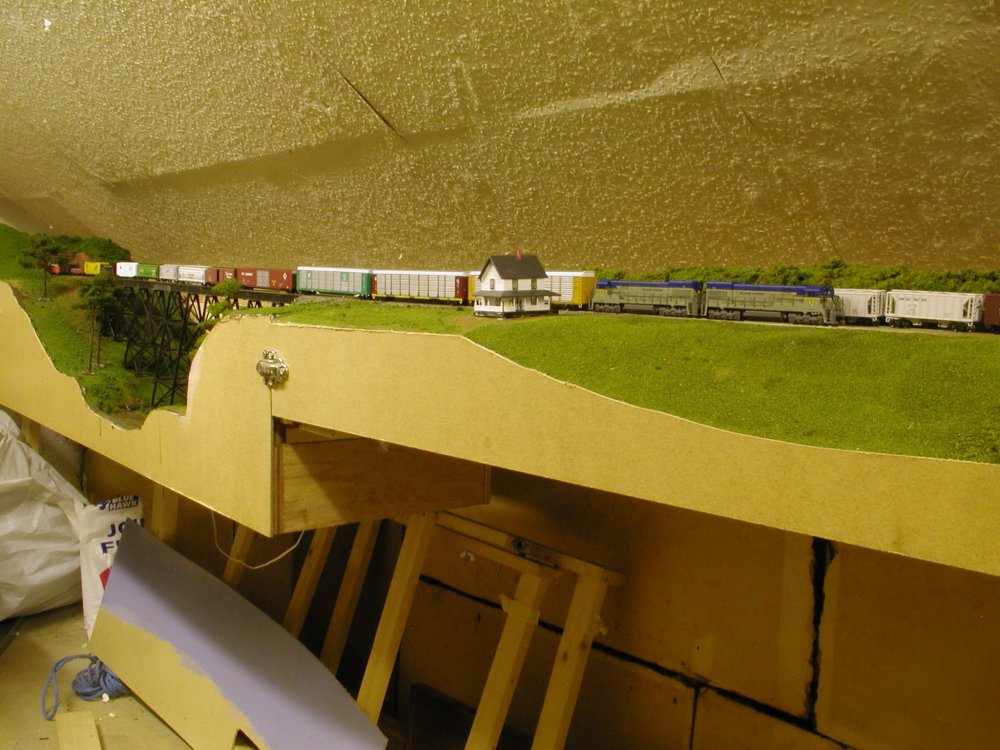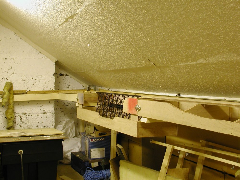 ONe-TRAK appears to have been devised in the late 1990s to allow more realistic operation (within an American context) and more realistic scenery by avoiding the "tile' effect of traditional modular layouts, the 15" group adapted a similar approach to 4mm British outline branch line modelling in the 1980s and more recently the "One Track Minds Group" modelling in New Zealand Railways in S Scale. One Track Minds went for 2' wide modules to allow reasonably realistic modelling of typical New Zealand Bush and Footrot Flats countryside. Modeler's essentially building small layouts with a modular interface. I experimented with modular construction in N gauge with open farmed baseboards about 20 years ago though never got beyond the development stage in terms of scenery Small yard with wooded mountain backdrop 12" wide 3'6" modules. Passing siding open frame construction 2--12"X4' modules, the original plan was to add an additional module to allow longer trains to cross. Tall steel trestle module interfaced with crossing siding modules. Open frame baseboard construction.