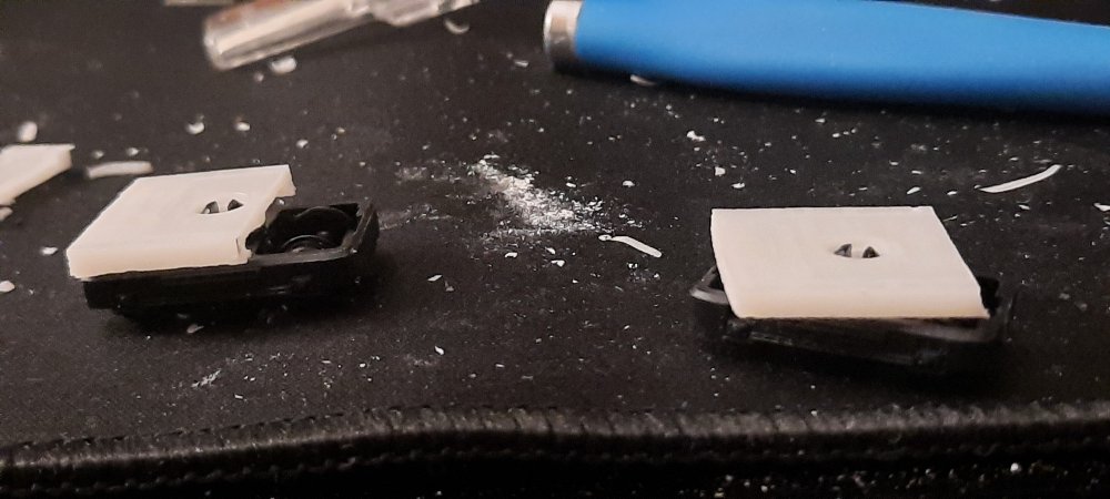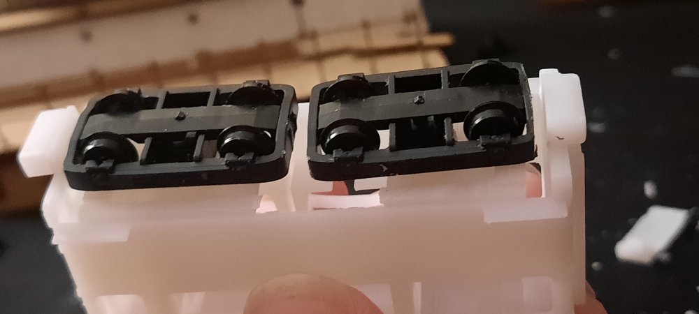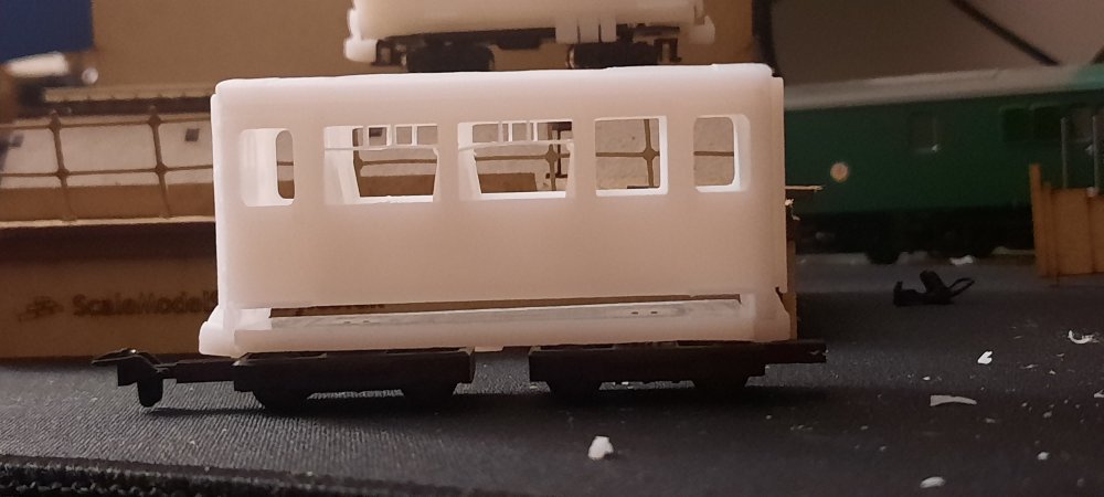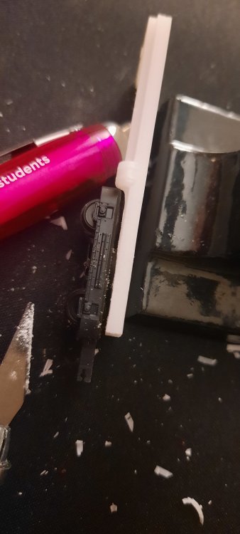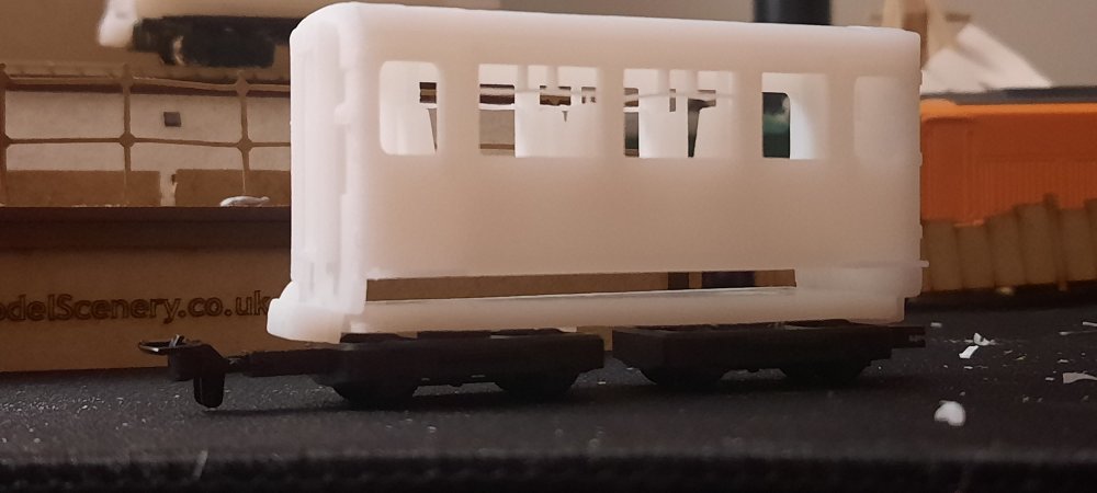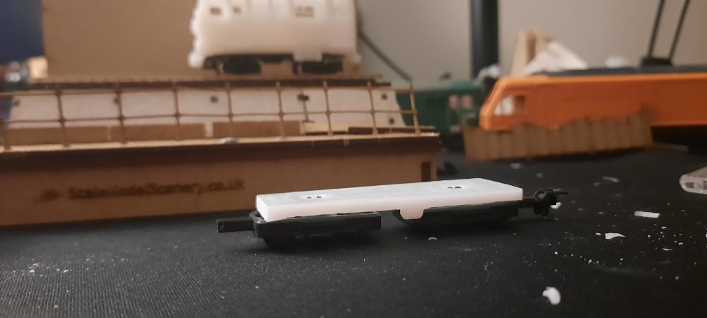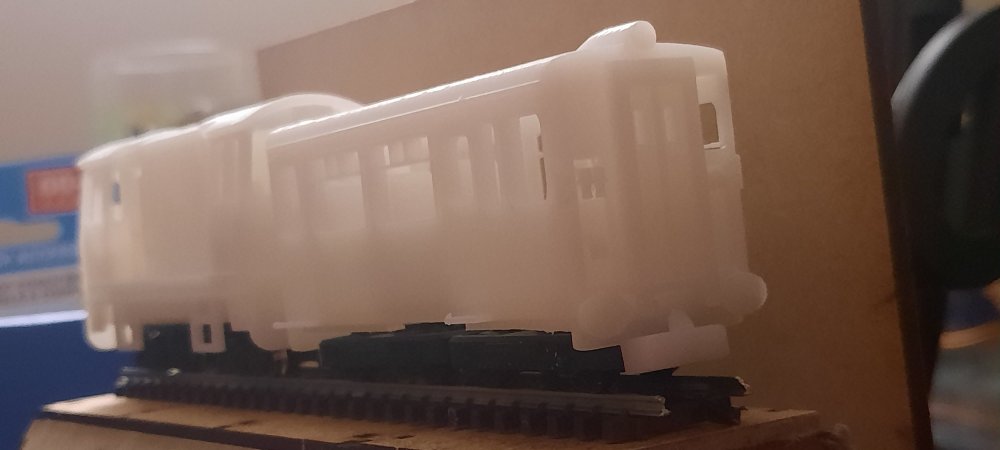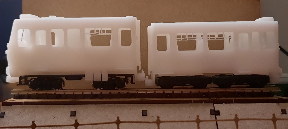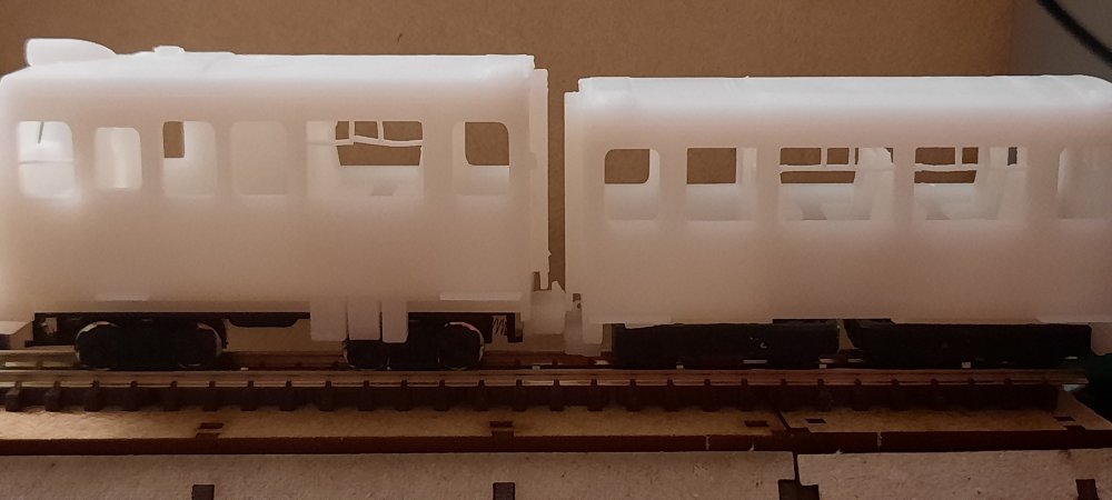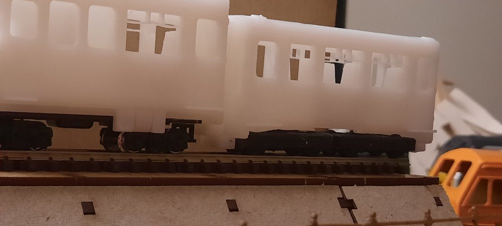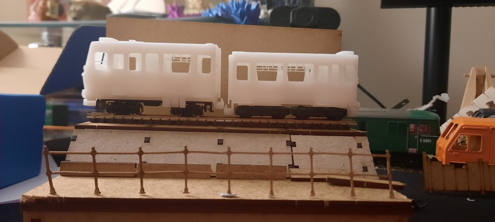 Baby 80 update, contiued.... A bit of work this evening on making some physical modifications before editing the files.... The chassis for the TSO / DTSO didn't fit in the shells as they where roughly 1mm too long in length, so, to the sanding paper they went! Sanded down each end equally & then tested till fitted. After getting the chassis to fit, it became apparent that the bogies didn't fit on the chassis, as they clipped. So, chassis removed, the overhangs were trimed off with a craft knife & the ends yet again sanded down. Bogies fit on the chassis, yay! Hang on, they don't fit on the coach, as they overhang by a few mm. Sigh. Decided to take the hacksaw to the chassis, now they & the bogies fit! I will of course fix these in the files before the next prototype print. Now that its finally on the track, i can see that the PC is one coupler height too high, so, that will also be fixed in v2 of the 3D model, along with triming the inner side of the underframe details to allow freer movement of the bogies. But, as of mentioned earlier, this is to be expected & is all part of the first prototype. Attached images show the problems, the modifications & the DTSO & the mini Vale locomotive by Daves Railway Bits.... I shall update the 3D models on Monday!