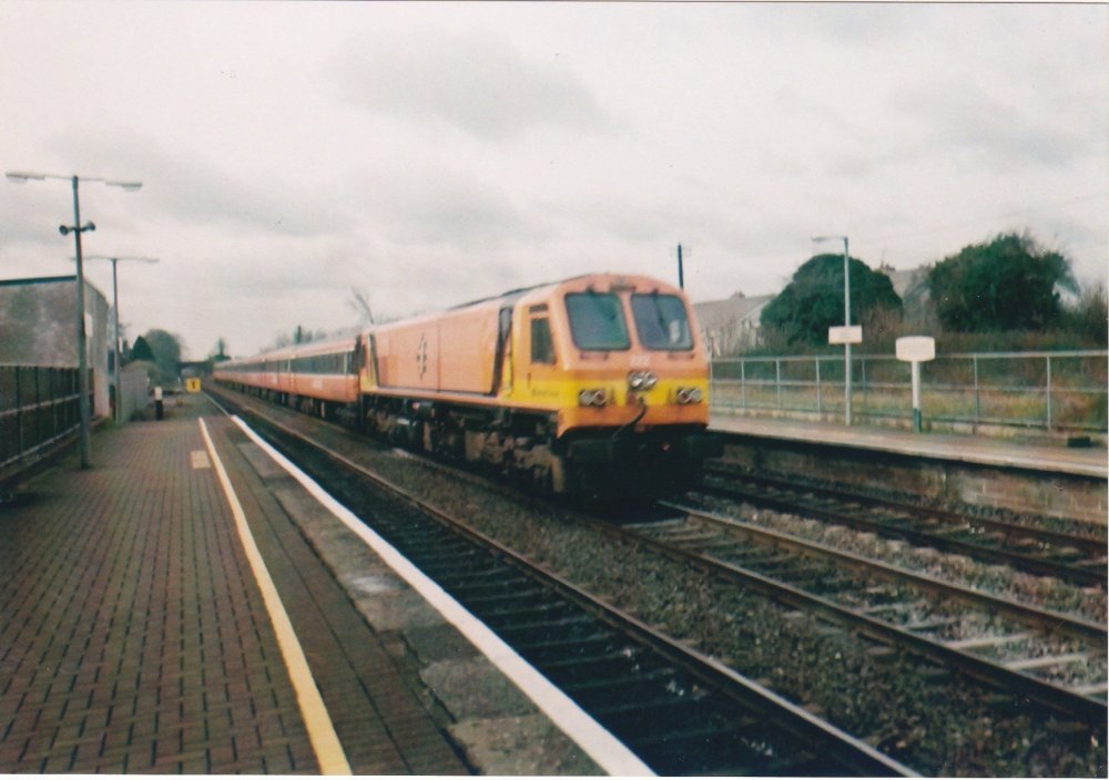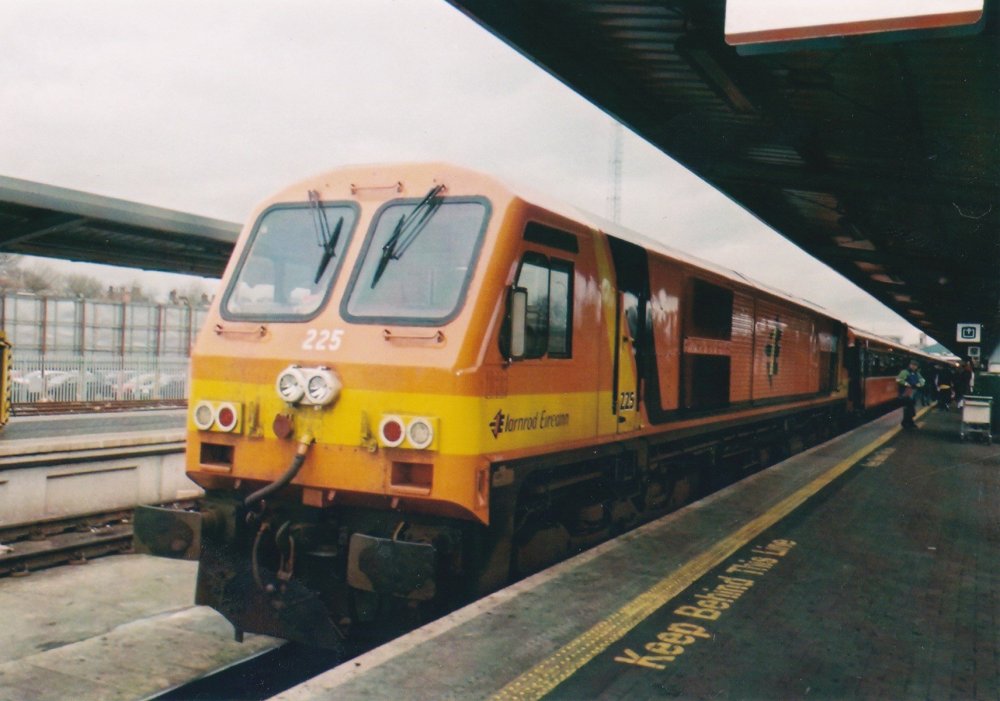 Was going through photos to scan and came across this from 19th February 2005. 225 (not long out of the works I think) at Heuston on the 10:45 Waterford-Dublin. The keen-eyed will see that the 'Iarnród Éireann' lettering underneath the windows is a larger font size than normal. I think only a handful were done like this; the 'yellow front' orange variation was rolled out later in 2005 and this dispensed with the company name below the windows (although it was retained on the 'Intercity' version).
