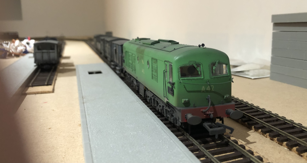 Castletown West continues to be tested. Scenery is a good way off yet, but we'll get there. Some of the resident locos to be seen here. The plastic platforms are off an old layout and are only there to establish where exactly to put permanent ones.