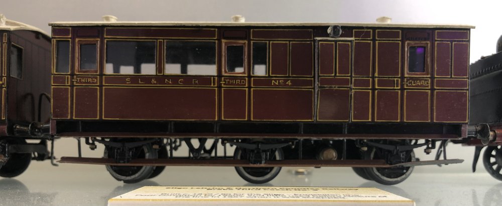 More from Fry, for our SLNCR fans. Fry has reproduced the rich maroon coach livery nicely, as this was rarely clean in traffic. In Senior’s time in Enniskillen, he only ever saw two coaches repainted and none cleaned. The two were six-wheel open brake 3rd No 4, shown by Fry here, and one of the bogies. The others were so utterly woebegone looking that where the paint hadn’t actually peeled right off to bare wood, the vehicle was so caked in soot and brake dust that you’d never know what colour it was at all! All postwar repainted were plain dark red / maroon, none with lining. With the locomotive, he has picked out what is believed to be the original livery the SLNCR used. At some stage at the start of the 20th century a very much darker green was used on at least a couple of locos, but by the time Senior first visited the line in the late 1930s, it seems that unlined black had taken over. Certainly, by 1950 all SLNCR locos were inclined black. On Lough Erne, the UTA added red connecting rods and their lining. -