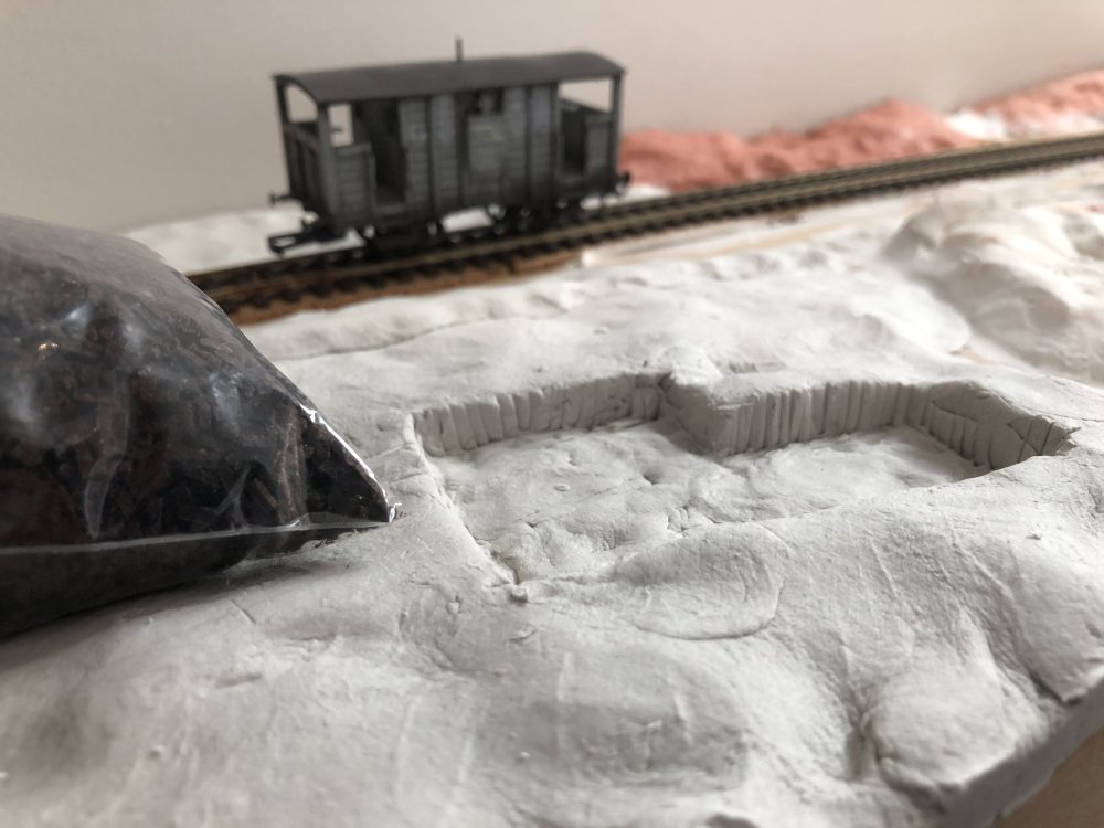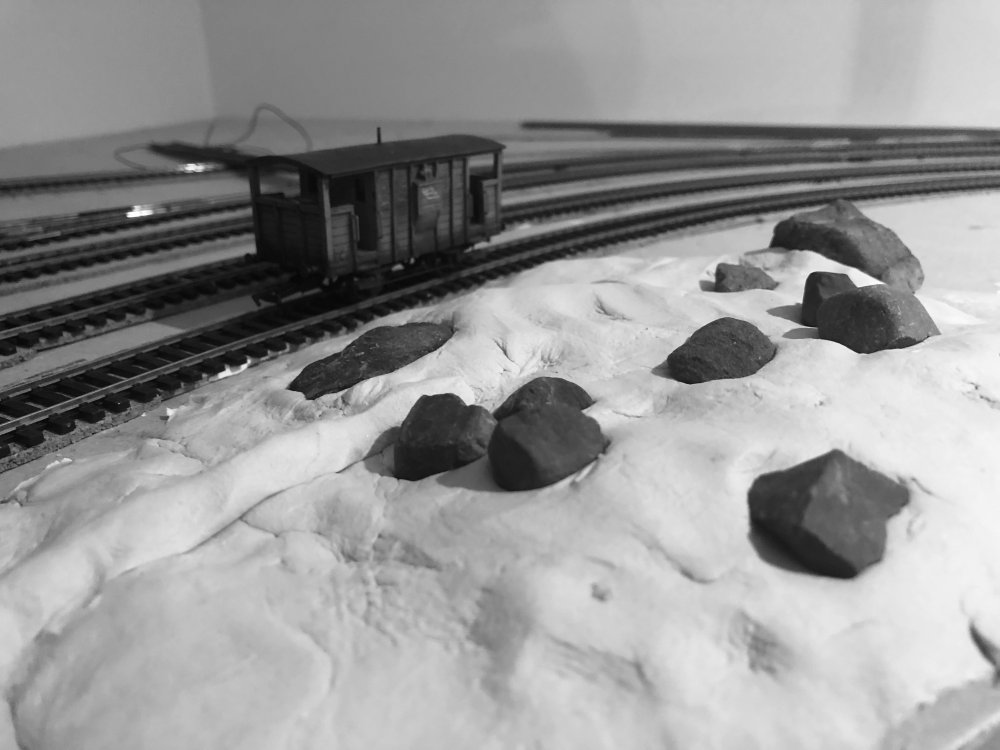 When starting scenery, in this case with DAS clay and a handful of stones out of the garden as rocks, I have found that it’s very easy to make even ground features very overscale. I have found that setting features in place first, then taking pictures of them in black and white against a backdrop of a wagon or locomotive, tends to show up very starkly whether they’re about right or not. Here, an area intended to be very rocky with gorse or brambles all round it. I removed some bigger ones, and pressed these ones down more into the DAS clay.