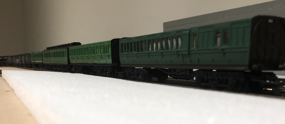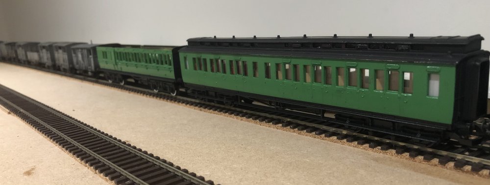 A few items I’ve had for years, and which cost me a possible total of £15 all together, now in the process of conversion. I’ll comment on each individually. First, a rake of four coaches in 1950s green. The type of model will be well familiar to all here. I need to get some "wooden" stock for 1950s use. First, these are very definitely in the "two-foot-rule" category. The ones nearest and furtherst away from the camera are those old GWR brake thirds. These, provided a FLAT rather than clerestorey roof is fitted, are the closest resembling anything Irish - there were two Waterford, Limerick & Western brake thirds (Nos. 937 & 938) which were very like these indeed - except that they had one less compartment. The one nearest is in the pre-1955 dark green, deliberately matt to look worn. The furthest away one plus the two in the middle are in the 1955-62 lighter green, same as applied to A, C, G601 (not G611) and B101 class diesels. They need to be lined, and three of the coaches, having had their clerestorey roofs removed will need to have flat-curve roofs made. (That's in hand). Lining, of course, will be the double pale green lines, one above and one below the windows, on the leading coach, as per the older livery, with "snails" added. The other three, being the lighter green, will have just the single thin line, waist level. I am trying to put together a generic wooden rake to go with my six-wheelers when they arrive. The six-wheelers will work on the branch - these things above will have to do, along with a green K15 and a green Park Royal, for the main line train until or unless a credible GSWR bogie model is made by anyone. The nearest coach will be WLWR 937. Roof, snails and new wheels needed - the existing ones are coarse scale and bump along the sleepers. Next, this coach may keep its clerestorey roof, albeit with the glazing in this part painted or sheeted over. There were a few GSWR clerestorey types kicking about even into the early 1960s, but this design of vehicle which is Midland Railway (England) in origin, is not REMOTELY like any GSWR clerestorey type, but it does look the part; a temporary solution to a dearth of wooden bogie coaches. being a 1st / 3rd composite, it's the sort of thing that could have been found on a mixed train on a branch with just the one coach - 1950s branch lines which had dispensed with six wheelers often had a vehicle like this with a six-wheel full brake or six-wheel brake 3rd. If this thing didn't have these curved-in ends, which in Ireland were only to be found on a handful of WLWR stock and nothing else whatsoever, it would look a good bit more GSWR-ish. The above WLWR-esque vehicle in the dark green was actually one of the very, very few prototypes which did. A short break from carriages; picked this little low-sided wagon ages ago. Gawwd knows where I got it, but its a GWR wagon from Brexitland. However, repainted, but with the "G" of "G W" deliberately showing, it can be an GSR wagon with CIE's paint wearing off. A distressed looking "snail" and CIE number, and weathering, will make it look about right. Another of what will temporarily run on the Dugort Harbour local train, as a GSWR relic. Lining and snails to follow. It would look more realistically GSWR with a flat roof, but I think I'll leave that one. Can't do much about these pesky curved ends though without a lot of major surgery which really isn't worth it. This came with the others. With curved ends, it has to be assumed to be a WLWR vehicle, but that compant never had any vehicle at all close to ths design; however, beggars can't be choosers. It'll do for a while. Needs new wheels too. The darker green one. Lining above and below windows on this. Plus, of course, a roof. The lighter green one the same; this will be WLWR No. 938, the above one 937. They were built (as far as I recall) 1896 or so, and withdrawn in 1954 and 1955.