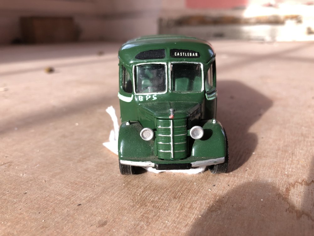Possible easy re-livery job. Now, I preface this by saying that I know very little about buses at all, but I believe this one is a standard type, as its a 1950s bought model, now in storage in Malahide Castle. It's not Fry's - it was re-liveried for the castle layout in the 1990s, in CIE livery, though it's an old model - presumably owned by someone else. However, it is worth mentioning as yokes like this were commonplace in rural areas in the 1950s. My knowledge of buses does not extend to confirming whether this is an EXACT type used here, or one which is just very like one that did - nor can i say how common they were. In any event, one at least was based in Galway, it seems, as late as about 1961. I took pics of this one this afternoon as I was poking about in the castle looking for things, bits'n'bobs, and stuff. The CIE green is authentic for steam locos, buses, road lorries, station paintwork, and passenger coaches which were painted between 1945 and 1955. Would it be worth IRM doing a run of a 00 scale equivalent of these? This one is 7mm scale, or as close to that as needs be.