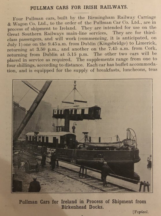 PRE-GROUPING AND GSR COACHES IN THE CIE ERA FOR MODELLERSjhb171achill replied to jhb171achill's topic in General Chat The GSR Pullmans, from a 1926 article. They were tried out on the Sligo line and into Limerick, probably via Nenagh; one per train. They eventually “settled” on Dublin - Galway and Dublin - Cork.