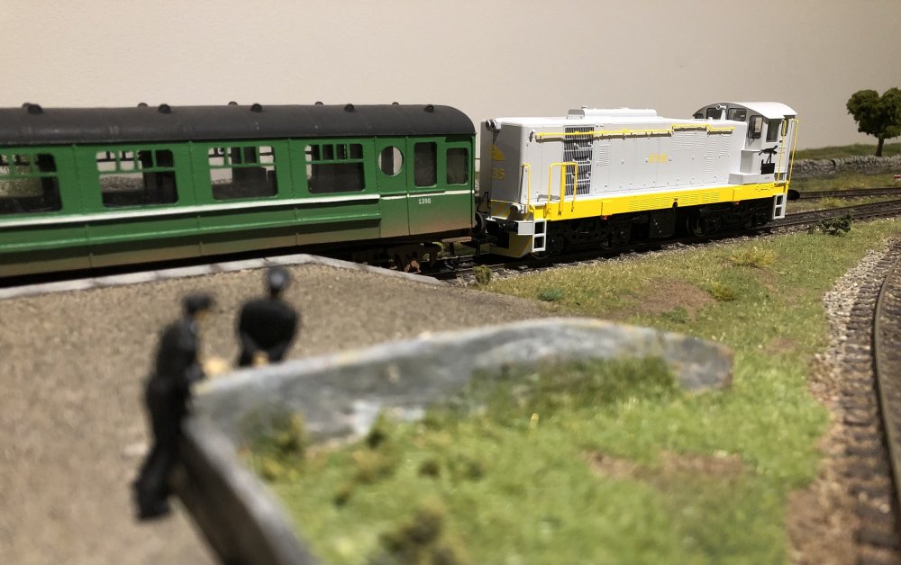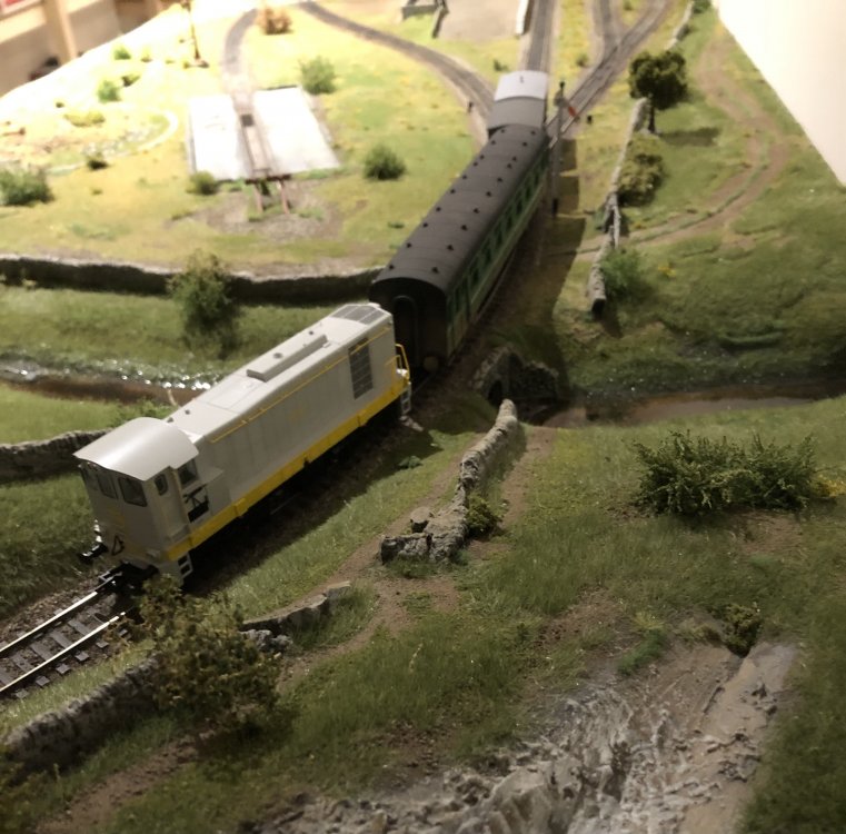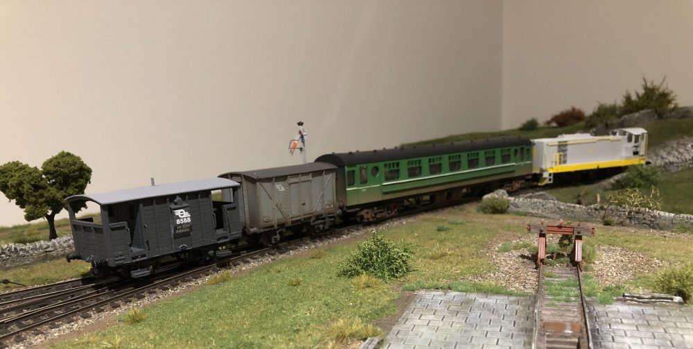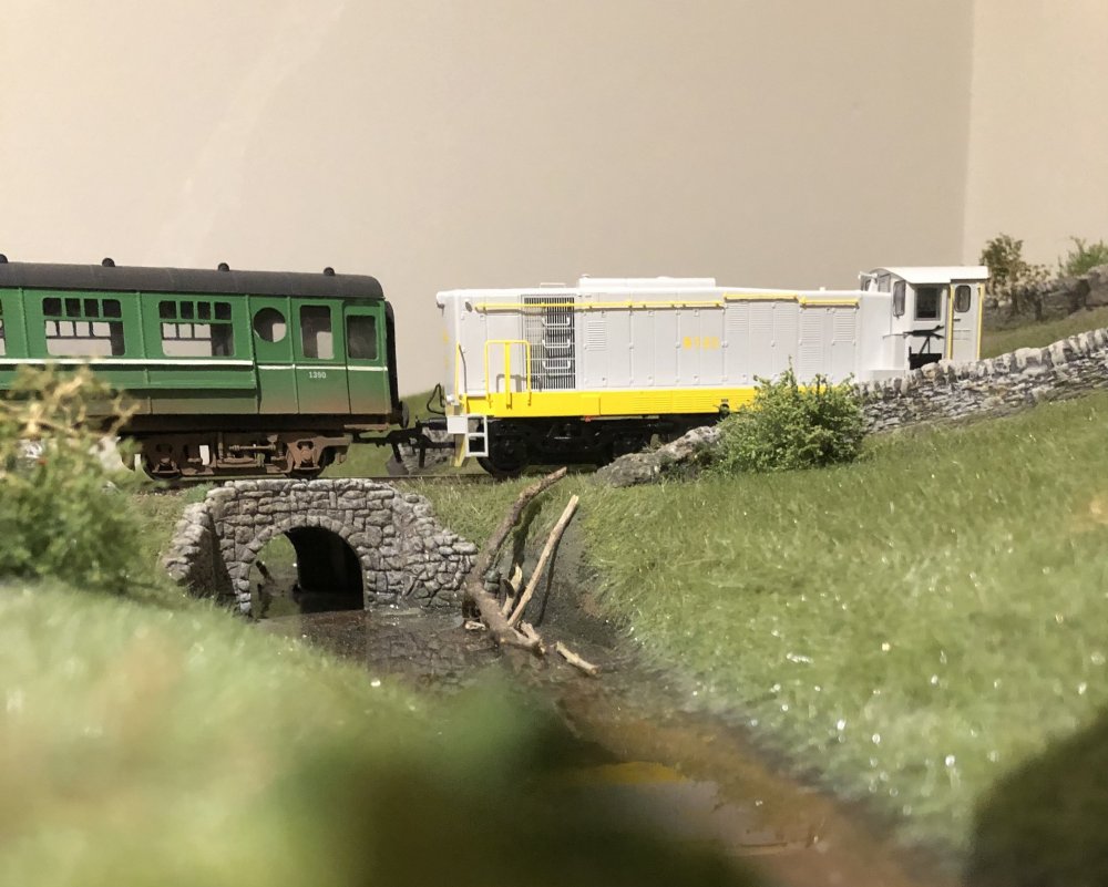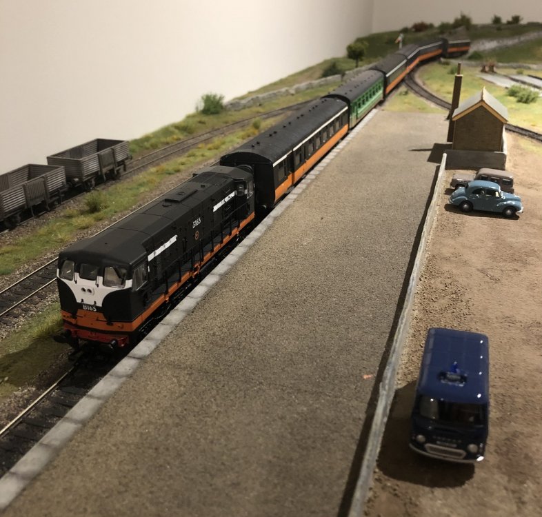 An earlier era, I suppose! I wanted to show just how squeaky clean and modern these locos were when new, with a design so totally unlike anything ever seen in Ireland, as well as a bright livery which, even if it would get dirty quickly (and it did!) it would have made such a massive impact, especially when it made its first forays into places still with a lot of steam, like Cork and Waterford. I need to get backscenes up behind these pics, but the legs of the layout are the wrong length, so I need to await the replacement ones before thinking about affixing anything like that to the wall behind. And when these locos were new, ALL coaches were green! (Except the few dirty silver ones remaining). Black'n'tan was still almost two years away, and more than that before more than a handful of coaches got that new livery.