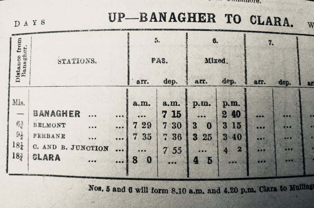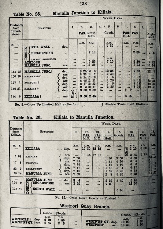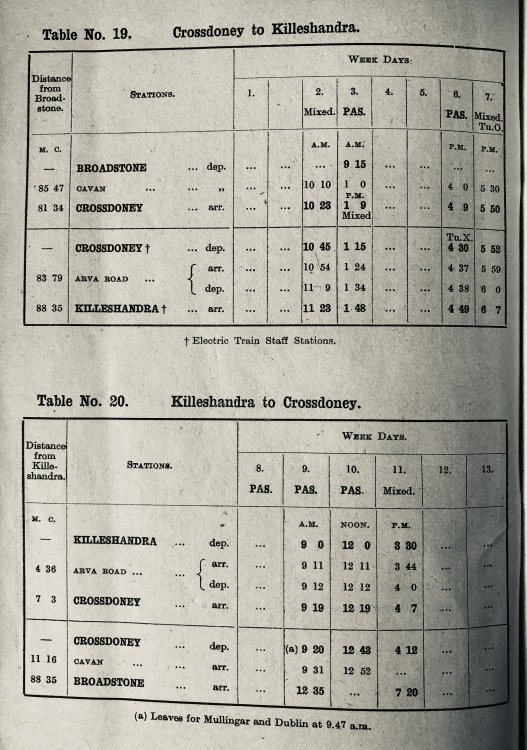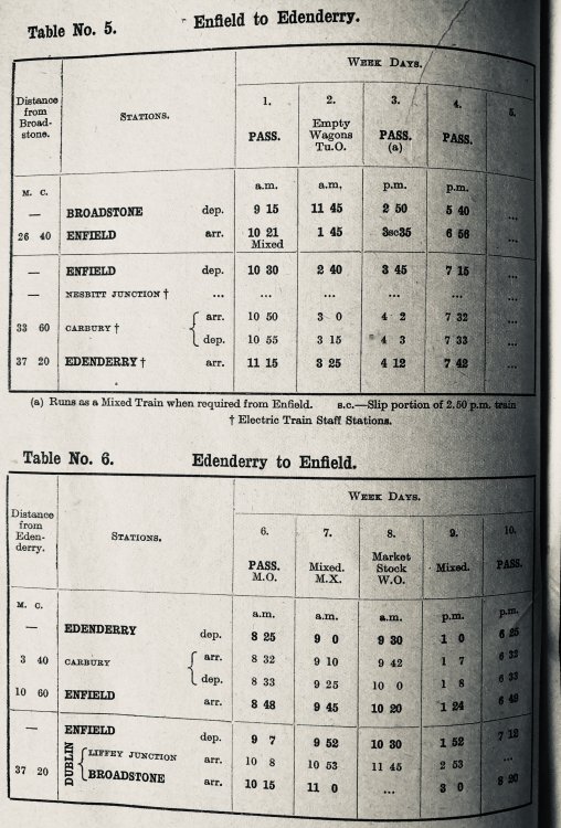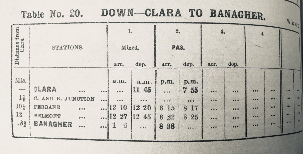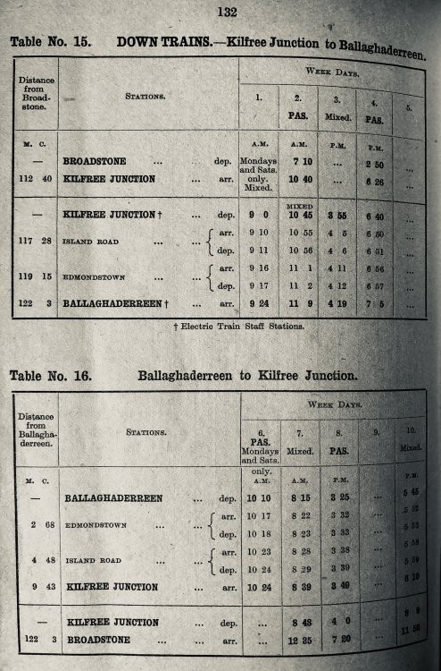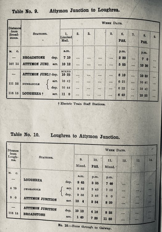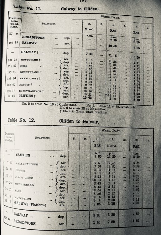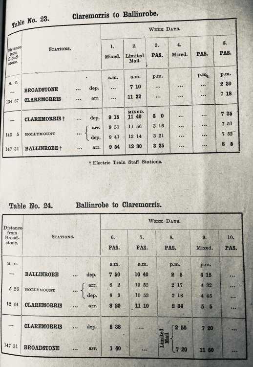 OK, to show service levels on Midland branch lines, these are from the GSR 1926 Working Timetable. I’ve a couple of actual MGWR ones but they are not handy to access, and tell 99% the same story anyway. These are typical not just of the Midland, but the great majority of the GSWR, DSER, CBSCR, GNR and NCC also, and the narrow gauge lines. Trains marked “Mail” were mixed. They were only designated as such on branch lines because they connected with main line up and down, day and night mail trains at junctions.