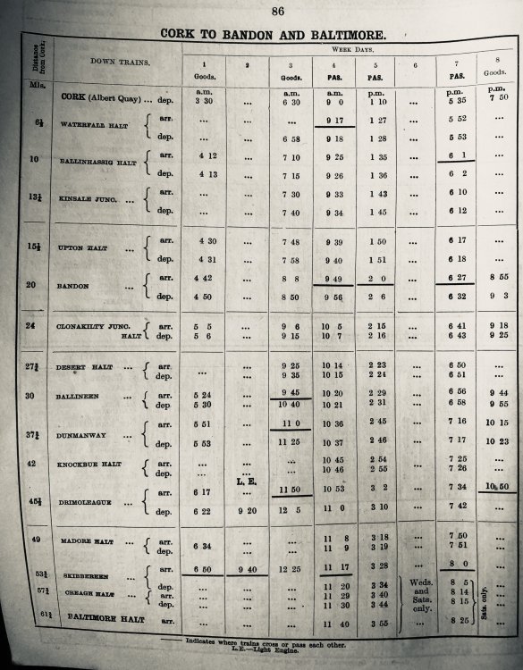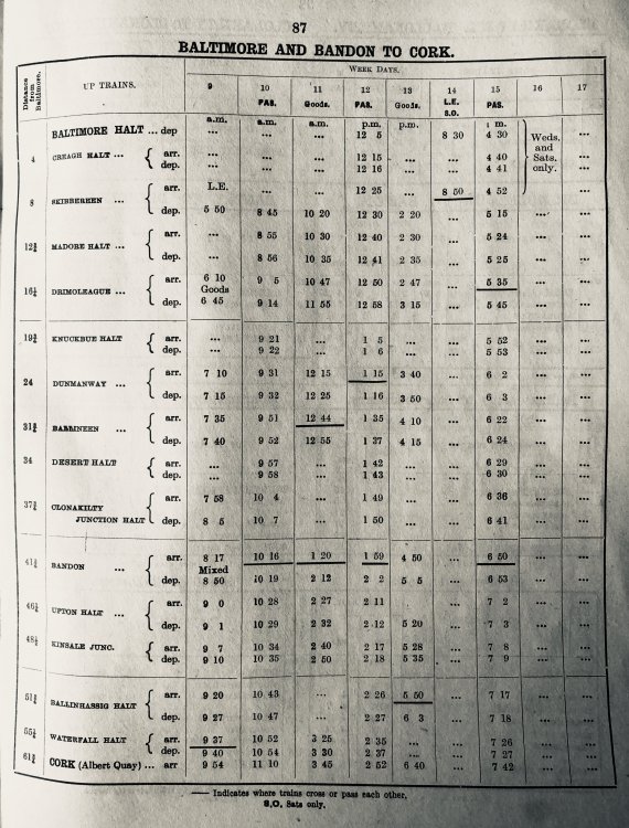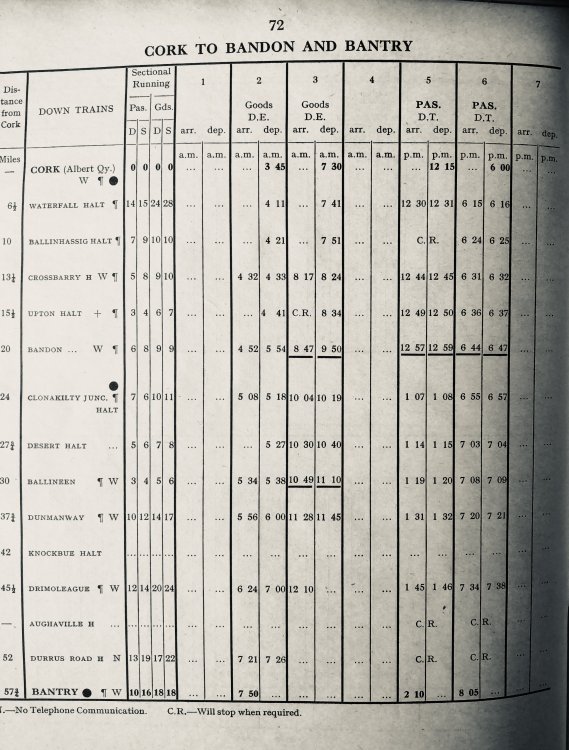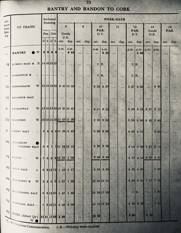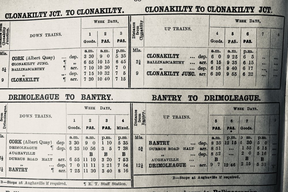 This is the timetable mentioned above Regarding West Cork. This is September 1960 onwards, the last timetable issued for the section before closure six months later. It was much the same as for many previous years. The two return passenger trains to Bantry were AEC sets, normally three-car. By this stage, the branches and goods trains were all “C” class diesels.
