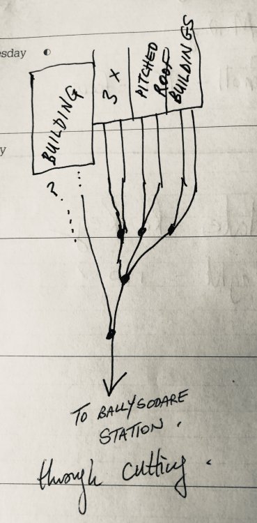 Folks, I was perusing two photos of the fascinating but little-known Polloxfens Mill siding at Ballysodare. The track layout there was extremely compact, and as can be seen from the attached rough doodle, achieved but means of one of Ireland’s few three-way sets of points. With seven adjacent, but short tracks, as a shunting layout exercise you could play about with about a dozen “H” vans at a time, with an oul J18, a “C” class or a 141, depending on what era you were interested in. This sort of thing would fit nicely into any tight layout corner.