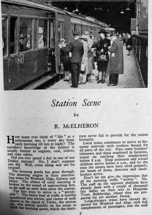 July 1947, and CIE, still a private company, is but two and a half years old. In these times most main lines had only two or three through trains per day. The writer of the following article would barely understand what Westland Row or Amiens St are like now, with DARTs included less than forty years after the article was written. An interesting insight, again, into the past. Note the train: the coach on the left is a GSWR open third of 1899-1910 era, possibly Downpatrick’s 836 or sister 837. It is still in GSR maroon. Behind it is a main line DSER coach in CIE green. The picture appears to be at Westland Row. -